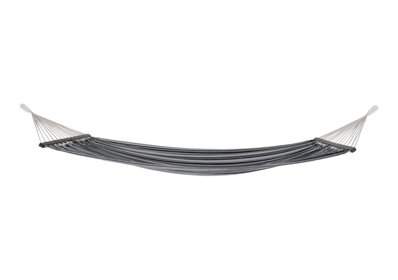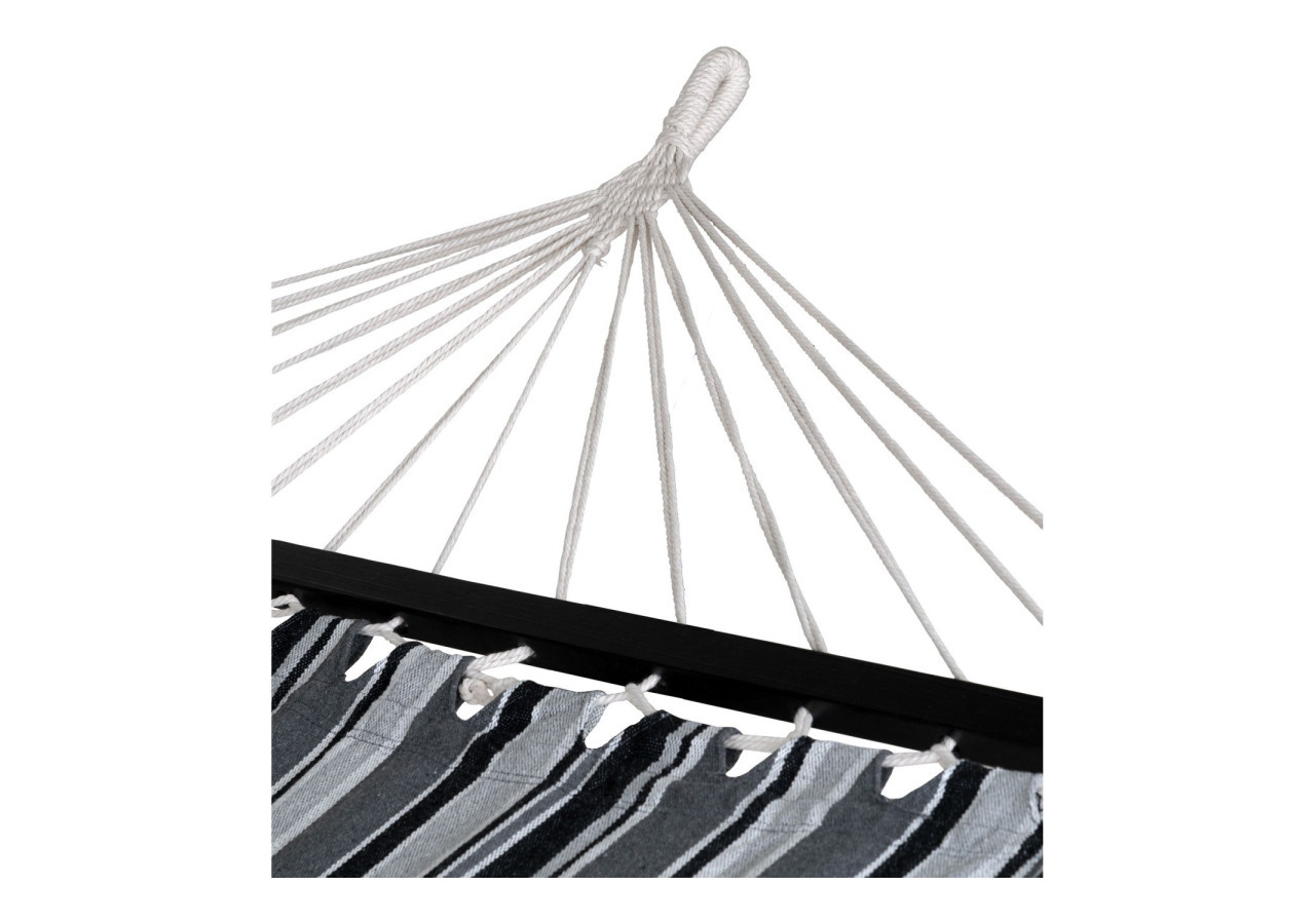 Le Hamac Lamia en polyester et coton est l'accessoire parfait pour vos moments de relaxation. Son design élégant en noir, gris et blanc sur bois de mélèze vous offre style et confort pour profiter de l'extérieur.
