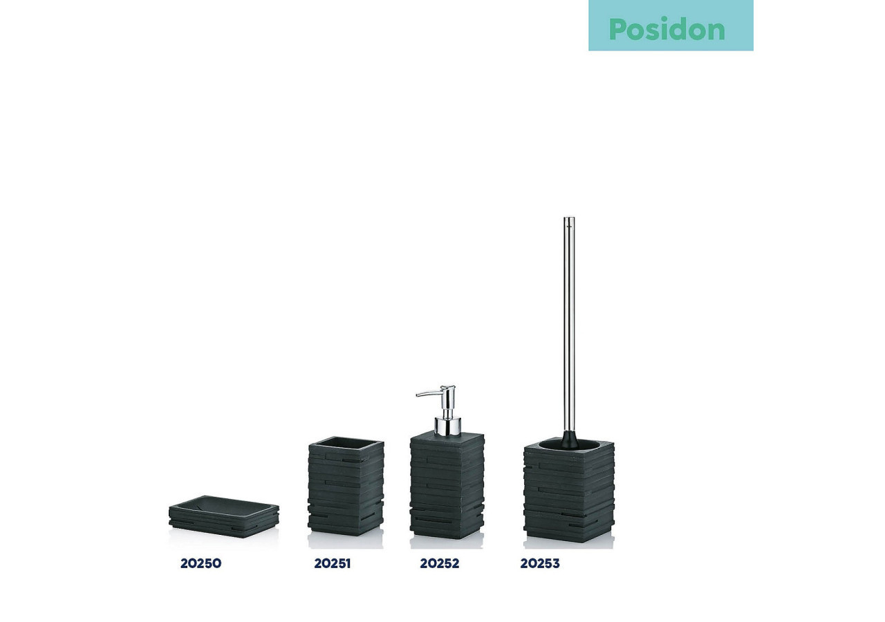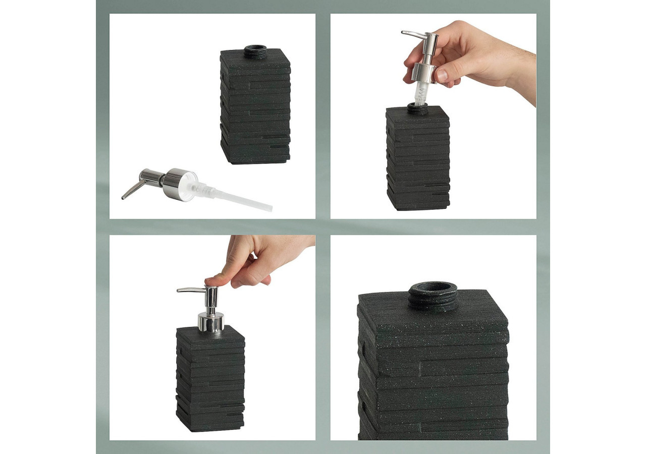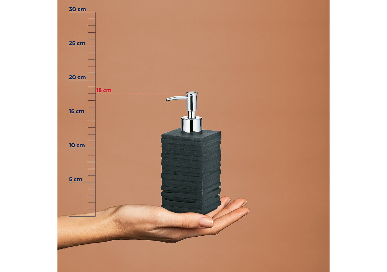 Découvrez le distributeur de savon Posidon, un accessoire de salle de bain au design unique et stratifié en noir qui attire tous les regards. Avec sa pompe robuste en plastique à finition brillante, ce distributeur allie esthétique et fonctionnalité. Sa capacité de 350 ml le rend idéal pour un usage quotidien. Complétez votre collection avec les autres articles de la série, comprenant un ensemble de toilettes, une tasse et un porte-savon.
