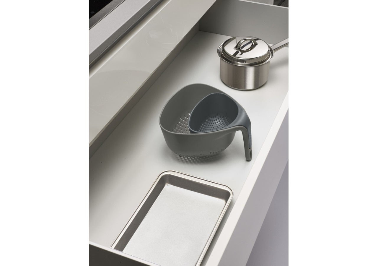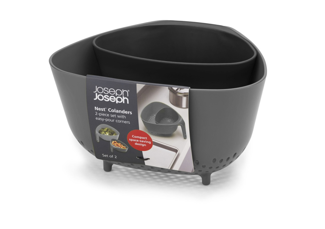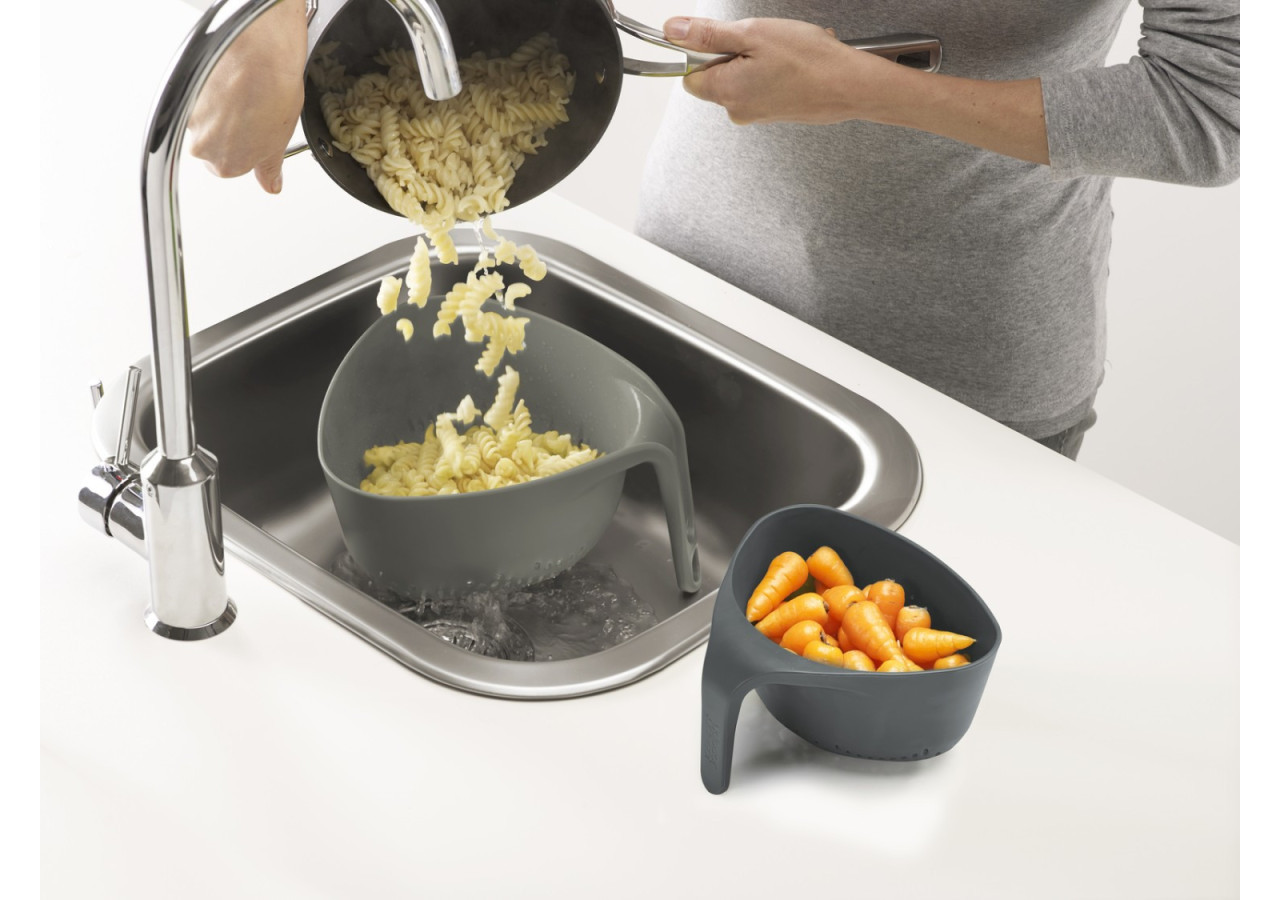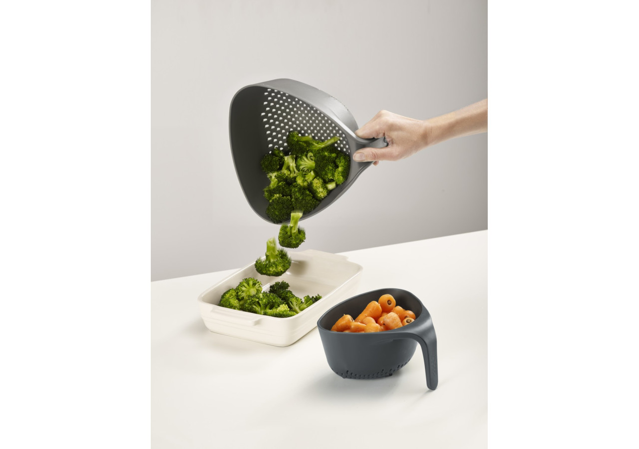 Découvrez l'ensemble de passoires triangulaires Joseph Joseph, conçu pour s'adapter à toutes les éviers. Compactes et empilables, elles vous permettront de gagner de la place dans vos rangements. Utilisez-les pour laver vos légumes ou égoutter vos pâtes. Grâce à leurs coins arrondis, le versement est simple et rapide. Fabriquées en plastique durable, ces passoires passent au lave-vaisselle pour un entretien facile.