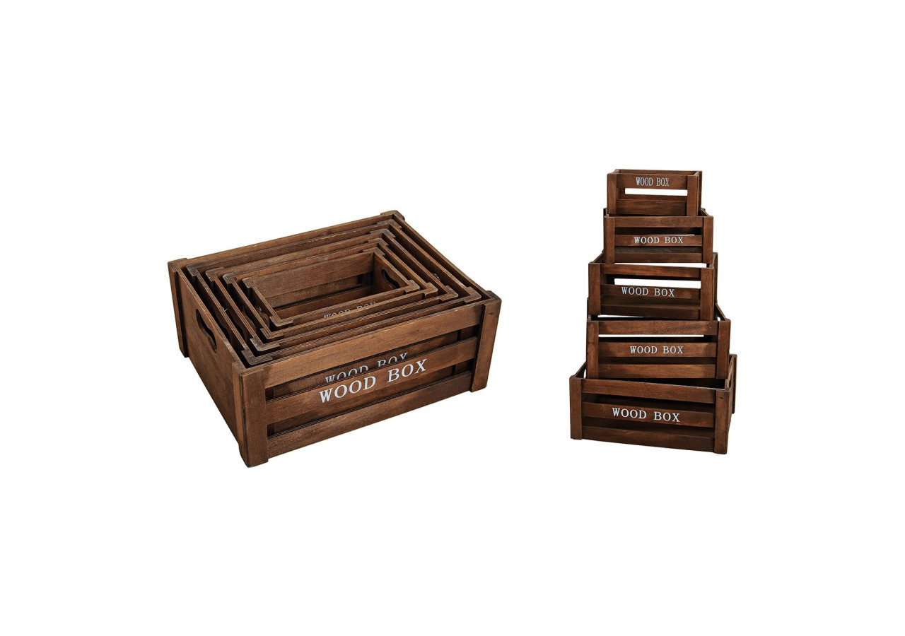 Organisez votre espace avec style grâce à notre set de caisses en bois de 5 pièces en brun. Chaque caisse mesure 37 x 28 x 15 cm, idéale pour un rangement esthétique et pratique.