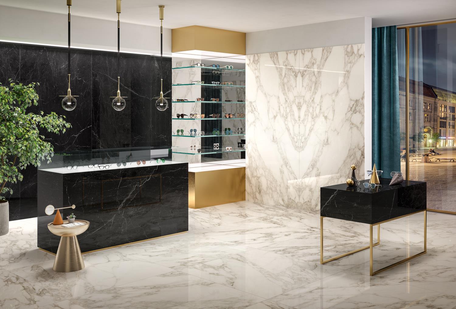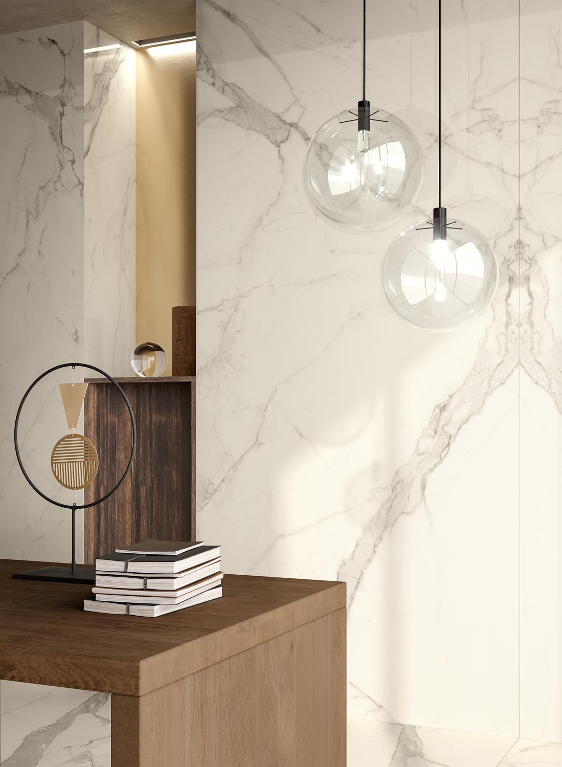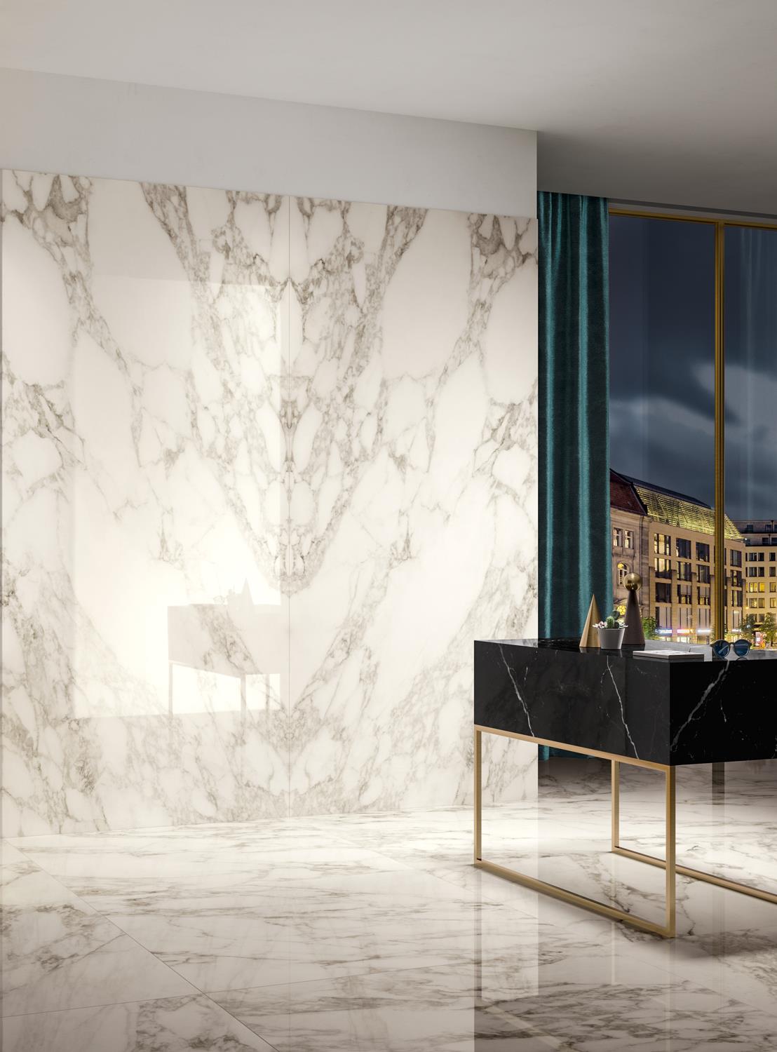 Effet miroir inspiré de l'artisanat typique du marbre. Un format exclusif qui permet d'amplifier de nouvelles perspectives dans le monde de l’architecture. Le décor bookmatch avec finition Lux, disponible dans les couleurs Arabesque Pearl et Statuario White, souligne encore mieux les textures à effet marbre avec des veinures « miroir » d’un grand impact esthétique.