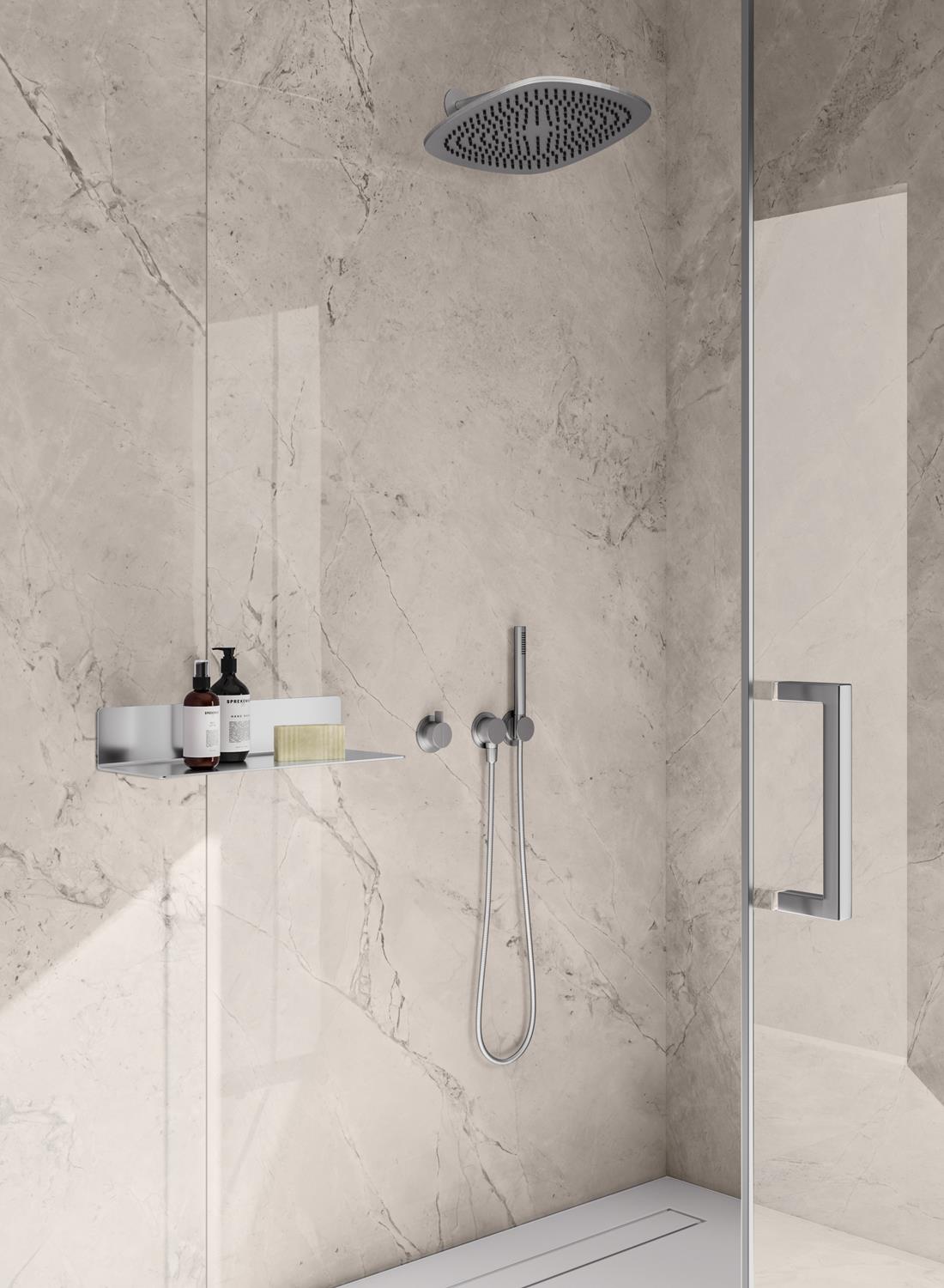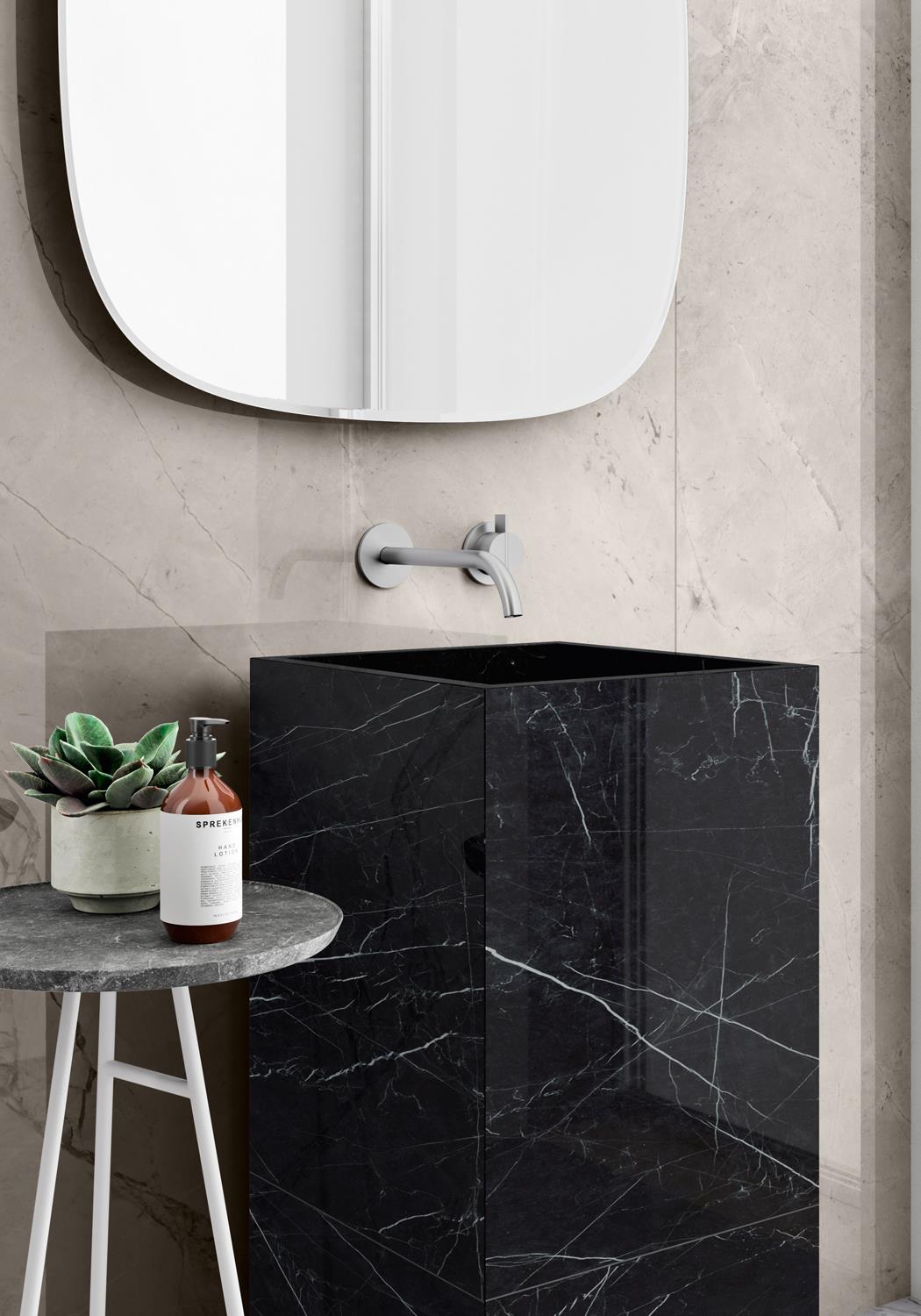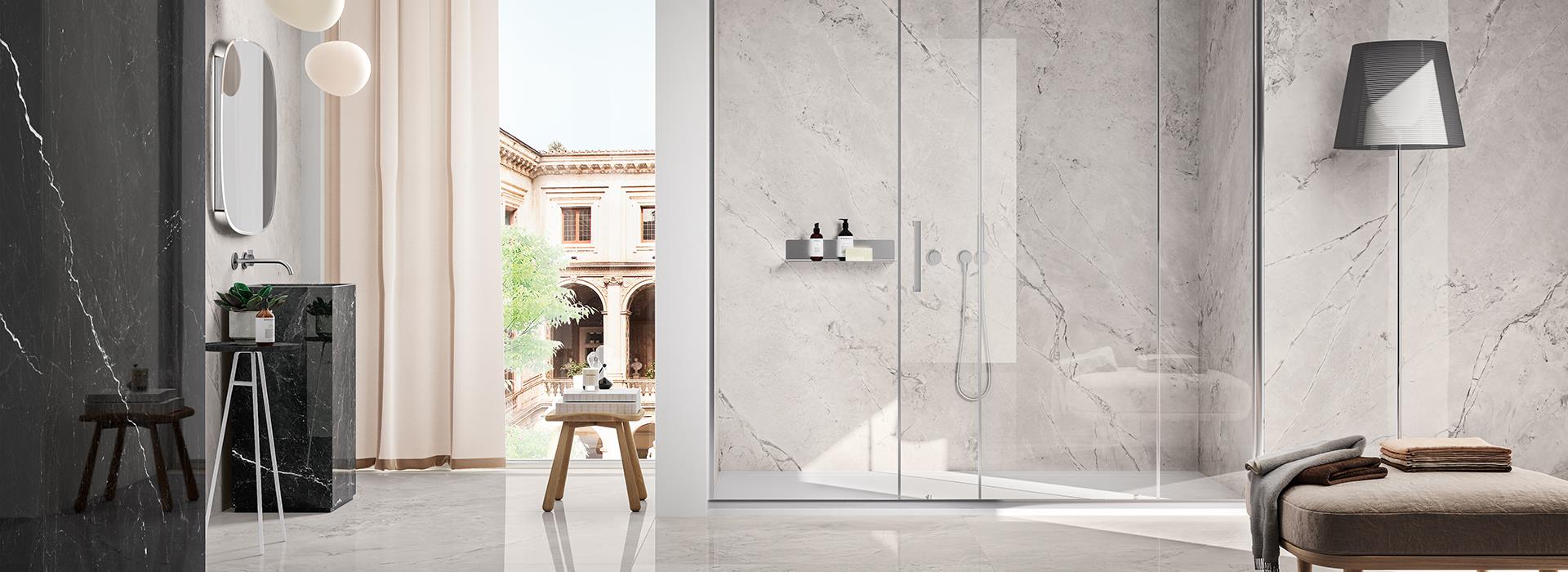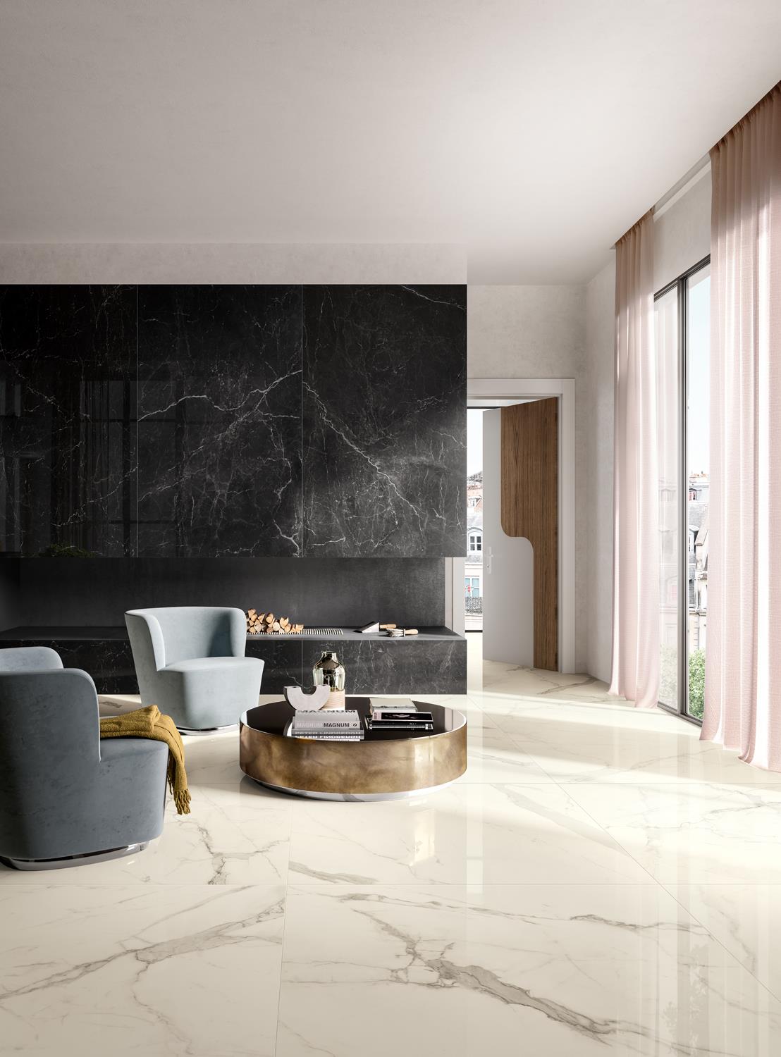 Effet miroir inspiré de l'artisanat typique du marbre. Un format exclusif qui permet d'amplifier de nouvelles perspectives dans le monde de l’architecture. Le décor bookmatch avec finition Lux, disponible dans les couleurs Arabesque Pearl et Statuario White, souligne encore mieux les textures à effet marbre avec des veinures « miroir » d’un grand impact esthétique.