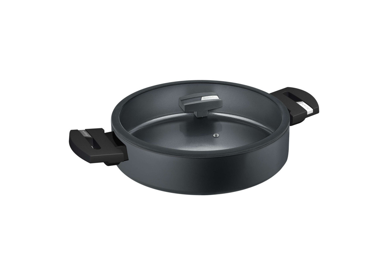 Compatible avec tous les types de feux, y compris induction, cette poêle de 28 cm est dotée d'un couvercle en verre qui permet de surveiller la cuisson sans perdre de chaleur.