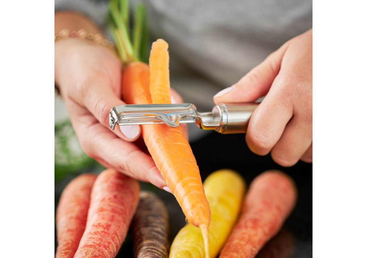 Équipez votre cuisine avec l'éplucheur I-Vorm pour gauchers. Son lame mobile est conçue pour éplucher facilement fruits et légumes à peau moyenne. La pointe double permet d'éliminer rapidement les imperfections, comme les yeux des pommes de terre.