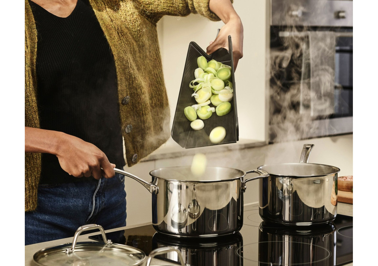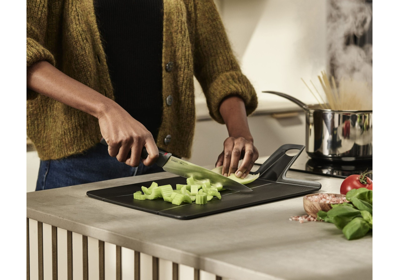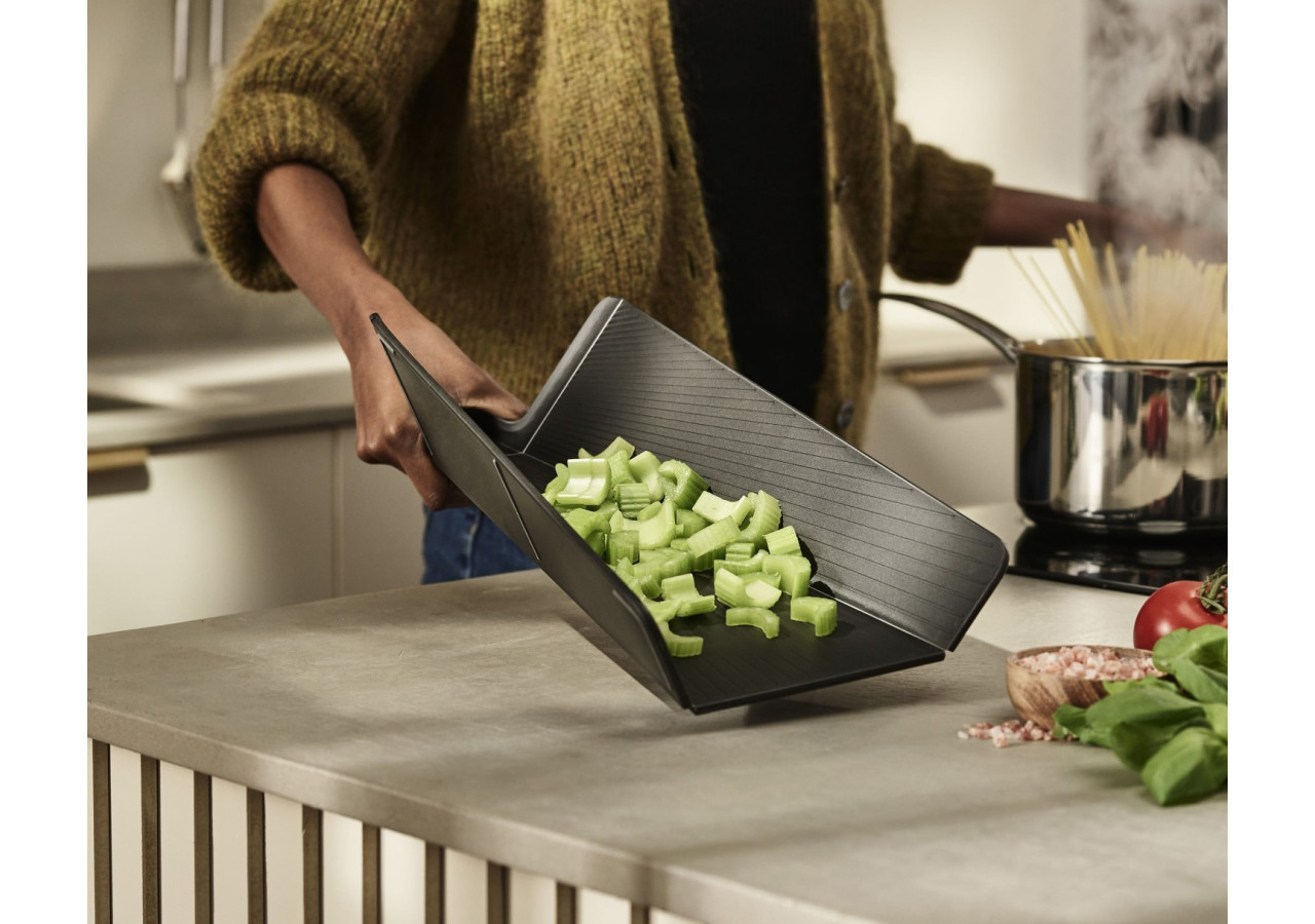 Découvrez la planche à couper Chop2Pot Plus de Joseph Joseph, le compagnon idéal pour une cuisine fonctionnelle et élégante. Cette planche à couper de petite taille se plie facilement grâce à sa technologie d'articulation innovante. Il vous suffit de presser la poignée pour relever les côtés et faire glisser vos ingrédients directement dans la casserole.