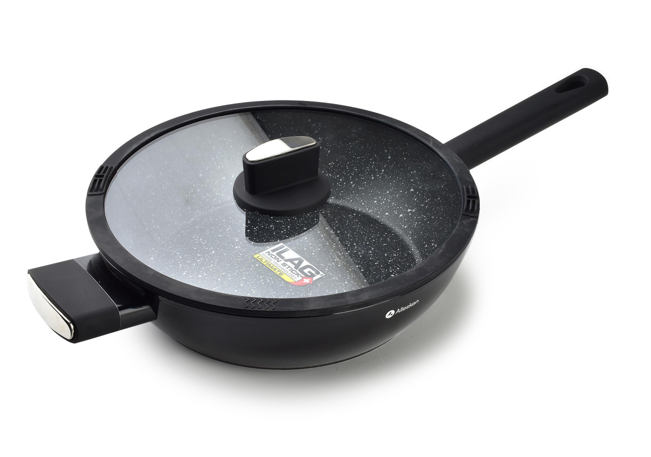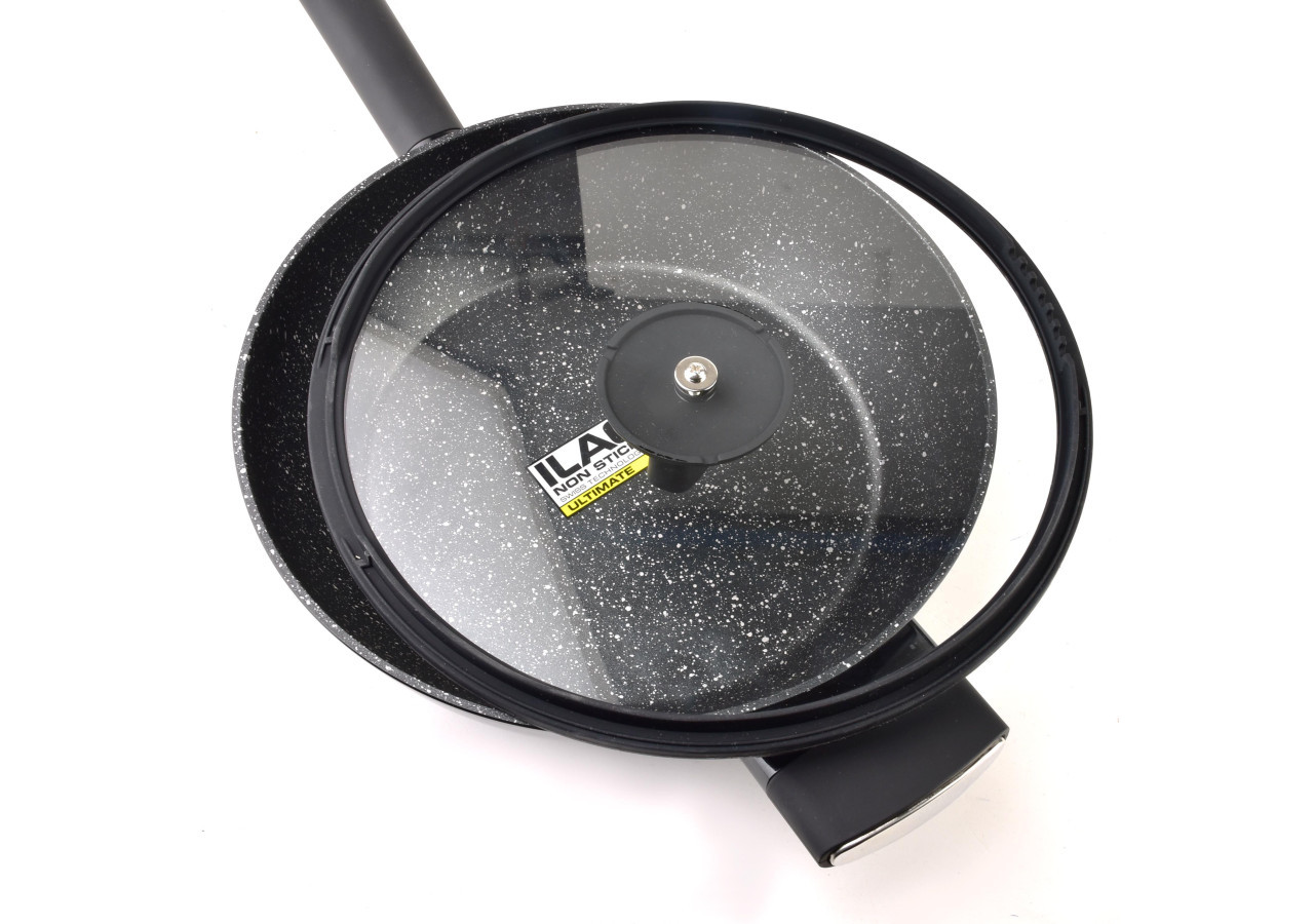 Cette poêle est livrée avec un couvercle en verre et un bord en silicone, idéale pour surveiller vos préparations. Compatible avec tous les types de cuisinières, y compris FULL INDUCTION, elle est conçue pour durer avec une base d'environ 4mm.