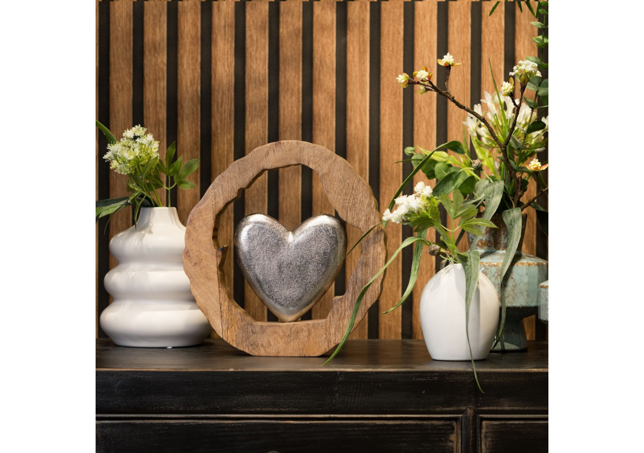 Ajoutez une touche d'amour à votre décoration avec ce porte-photo en forme de cœur en mangue. Avec ses dimensions de 28x29x5 cm et son cadre en métal argenté, il mettra en valeur vos souvenirs les plus précieux. Un choix parfait pour personnaliser votre espace avec style.