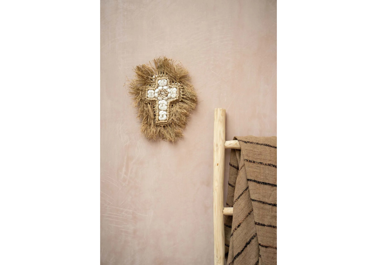 Ajoutez une touche côtière à votre décoration avec notre croix décorative en raffia. Recouverte de coquillages blancs, de macramé en coton et de raffia naturel, elle est parfaite pour être accrochée au mur ou posée sur une table.
