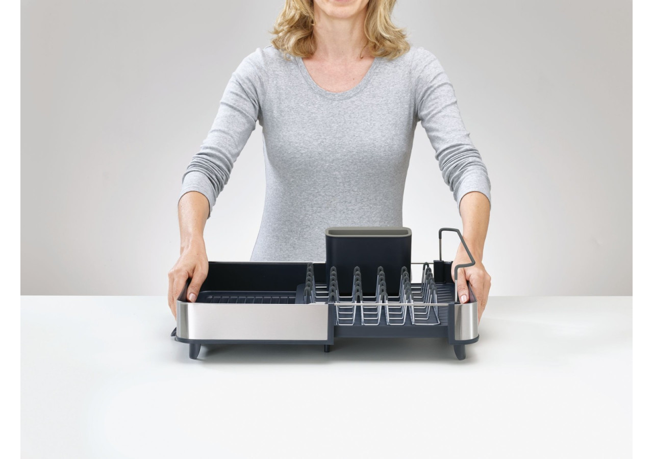 Découvrez l'égouttoir extensible en acier de Joseph Joseph, idéal pour les petits et grands ménages grâce à son design ajustable. Adaptez-le à votre espace et séchez vos verres, tasses et assiettes en toute sécurité grâce à sa couche protectrice contre les rayures. Sa base à ribs permet un drainage efficace de l'eau vers un canal d'évacuation, facilement orientable selon vos besoins. Profitez également d'un bac à couverts avec des fentes pour couteaux, pour une organisation optimale.