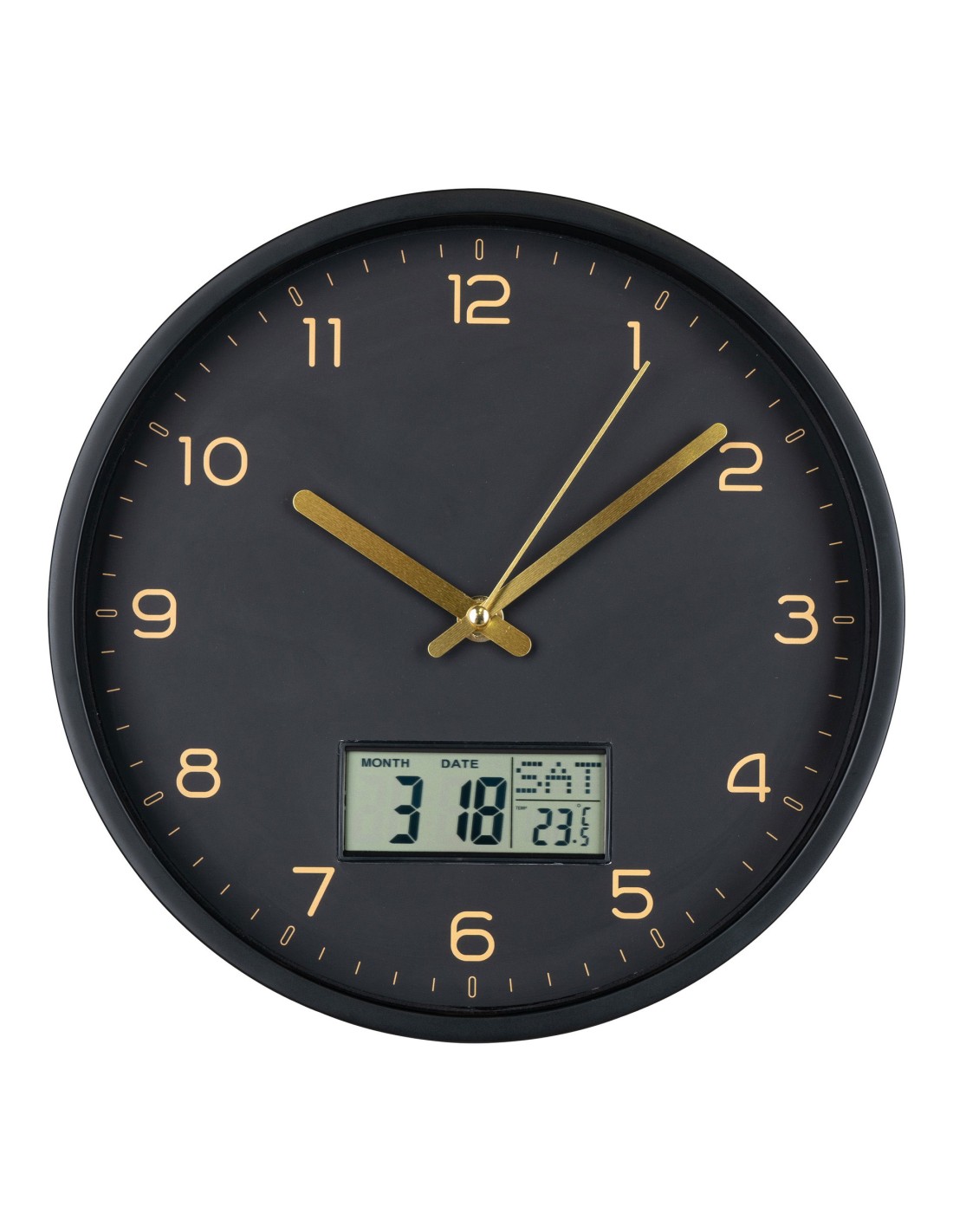 Restez à l'heure avec l'Horloge murale AMIENS, équipée d'un affichage digital moderne. Fabriquée en plastique noir et mesurant 25 cm, elle s'intègre parfaitement dans les intérieurs contemporains tout en offrant une lecture facile de l'heure.