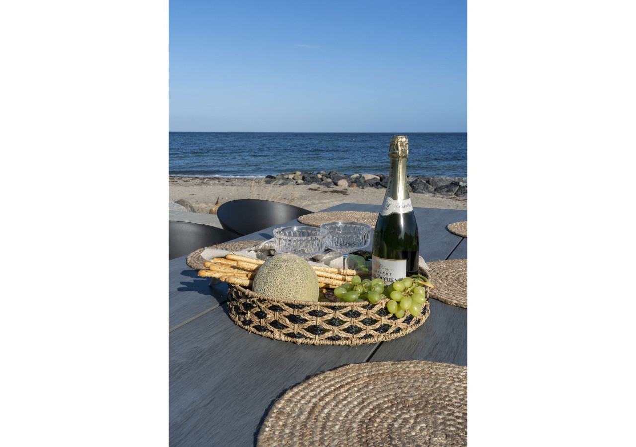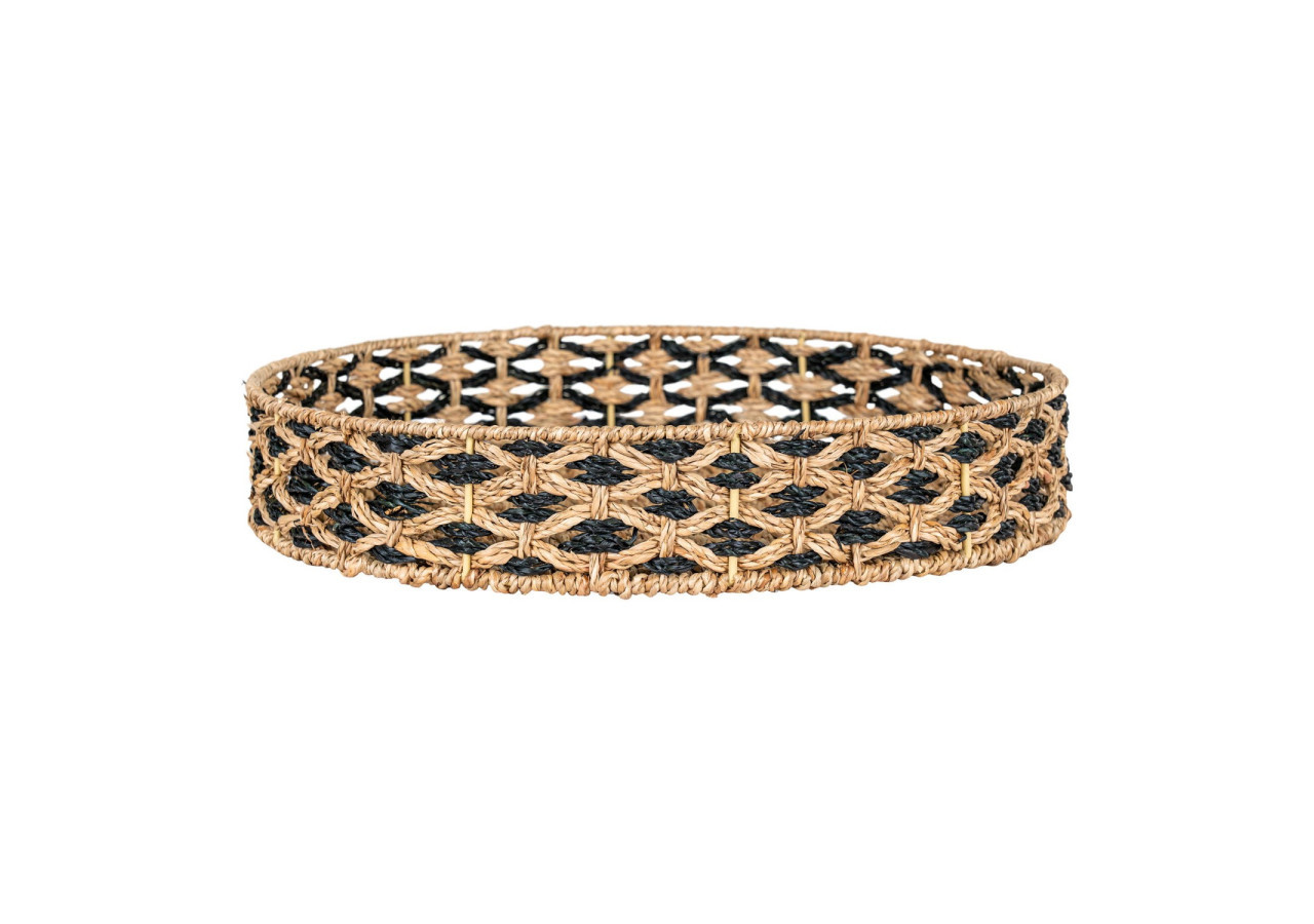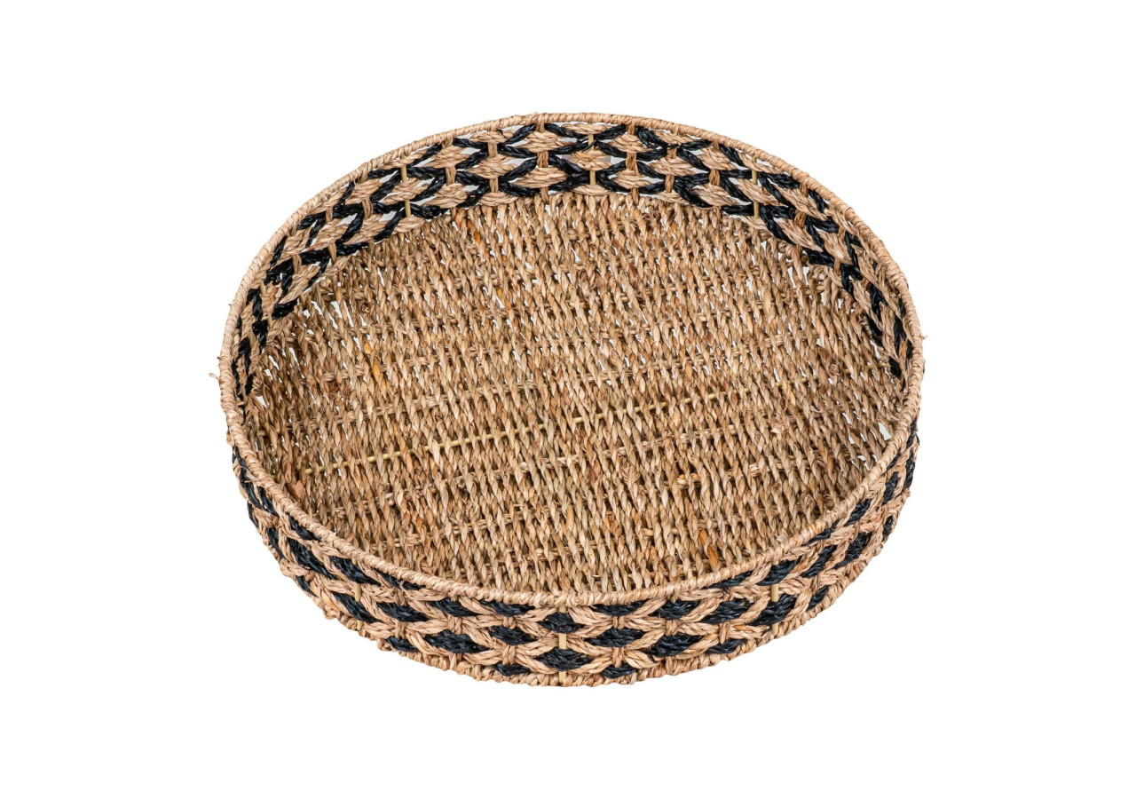 Ce plateau NERJA en herbe de mer, de couleur noire et naturelle, mesure 38 cm de diamètre. Parfait pour servir vos apéritifs ou comme élément décoratif, il allie esthétique et fonctionnalité, apportant une touche exotique à votre table.