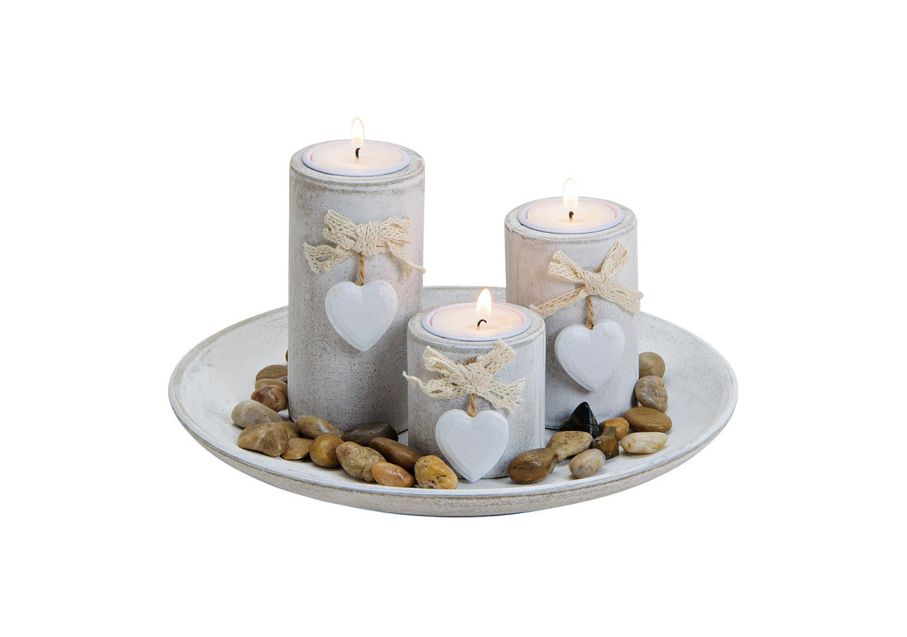 Ajoutez une touche romantique à votre décor avec ce bougeoir en bois blanc. Le set de 3 pièces mesure 24x12x24 cm et est orné de décorations en cœur, parfait pour créer une ambiance chaleureuse et accueillante.