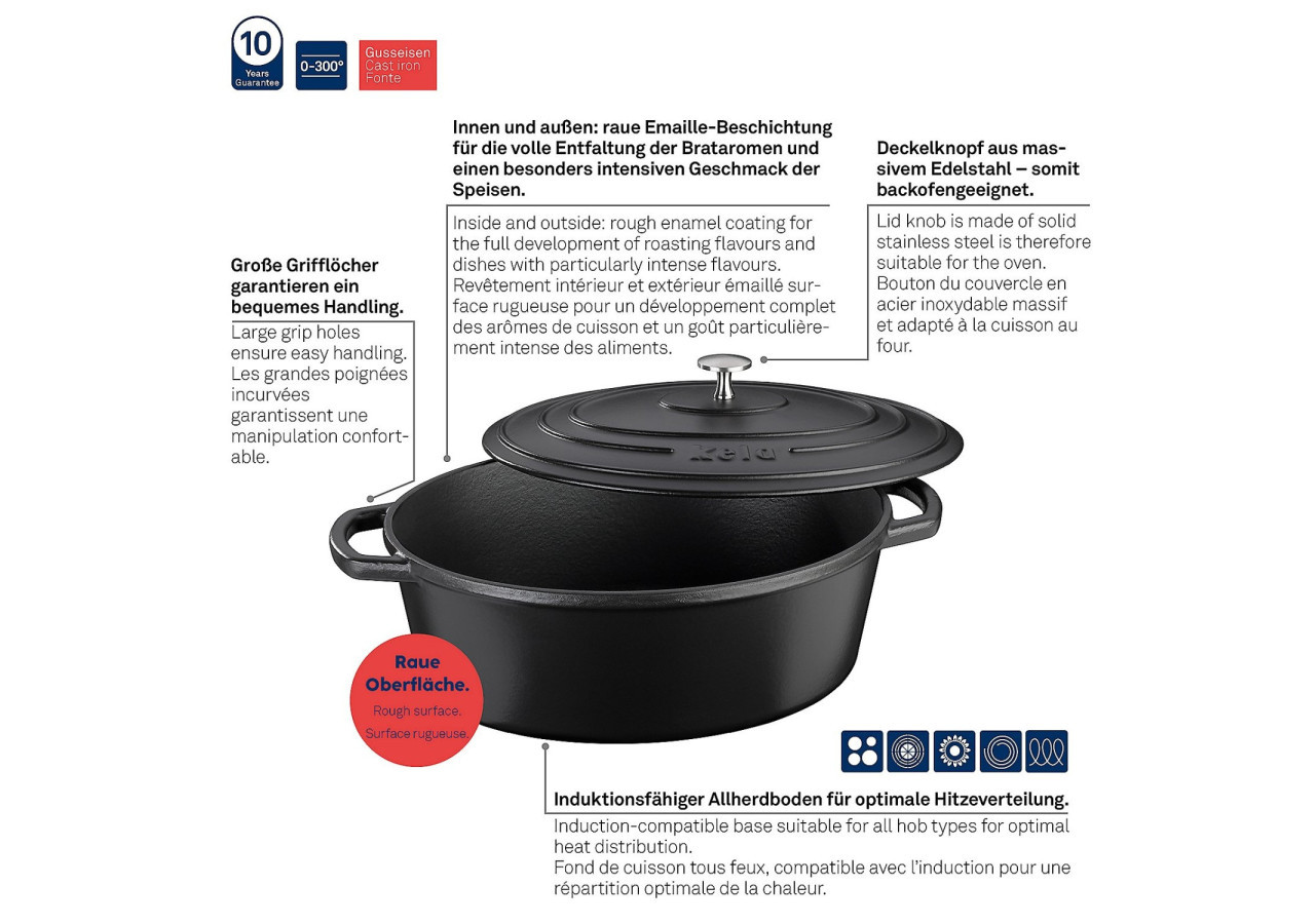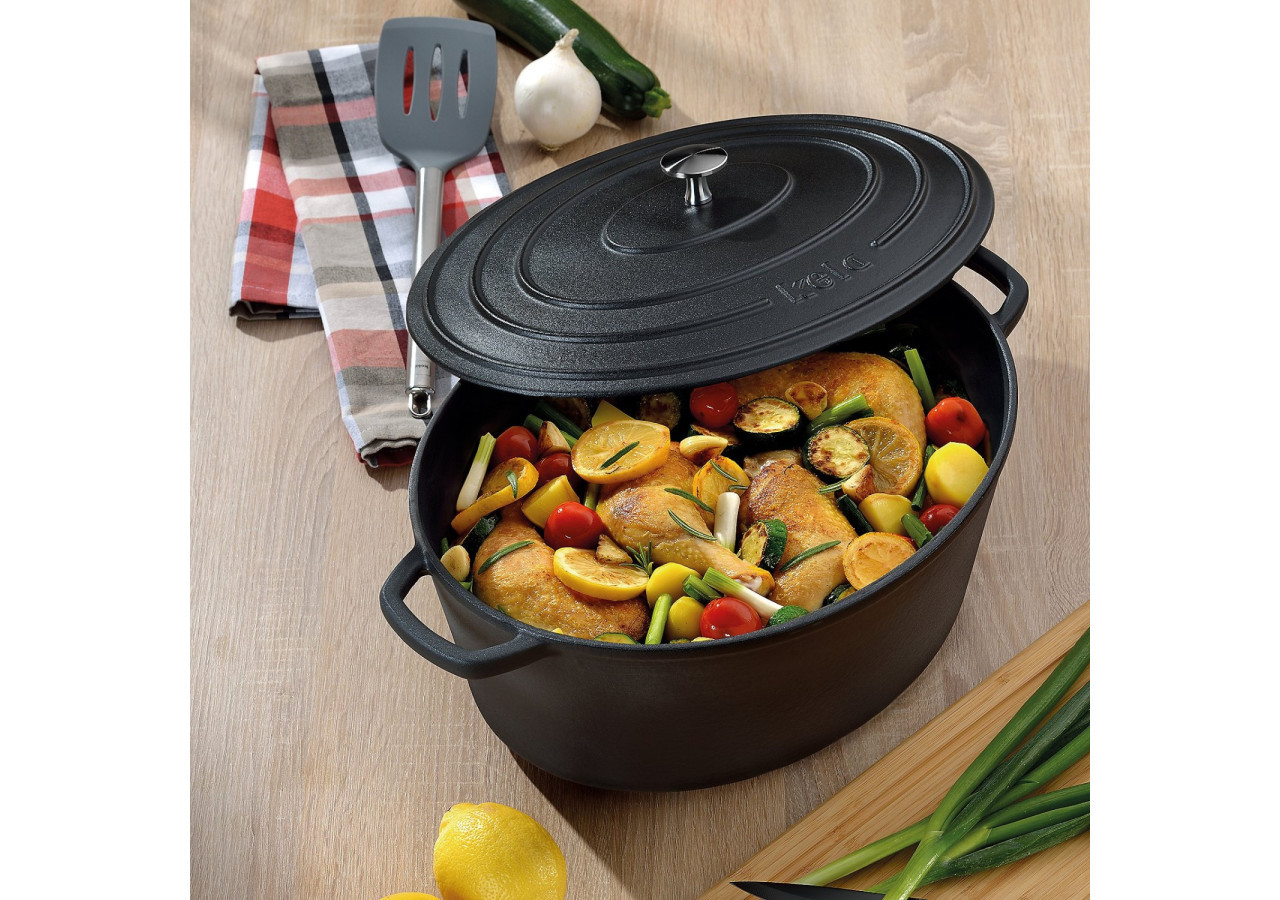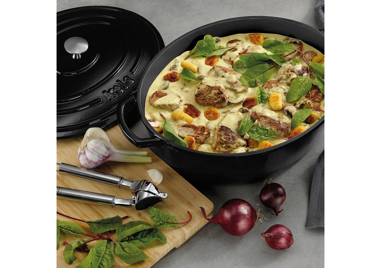 Découvrez la cocotte Calido de Kela, un indispensable pour vos plats mijotés. Avec sa finition noire élégante, elle mesure 36 cm de long et 29 cm de large, offrant une capacité généreuse de 9,3 litres.