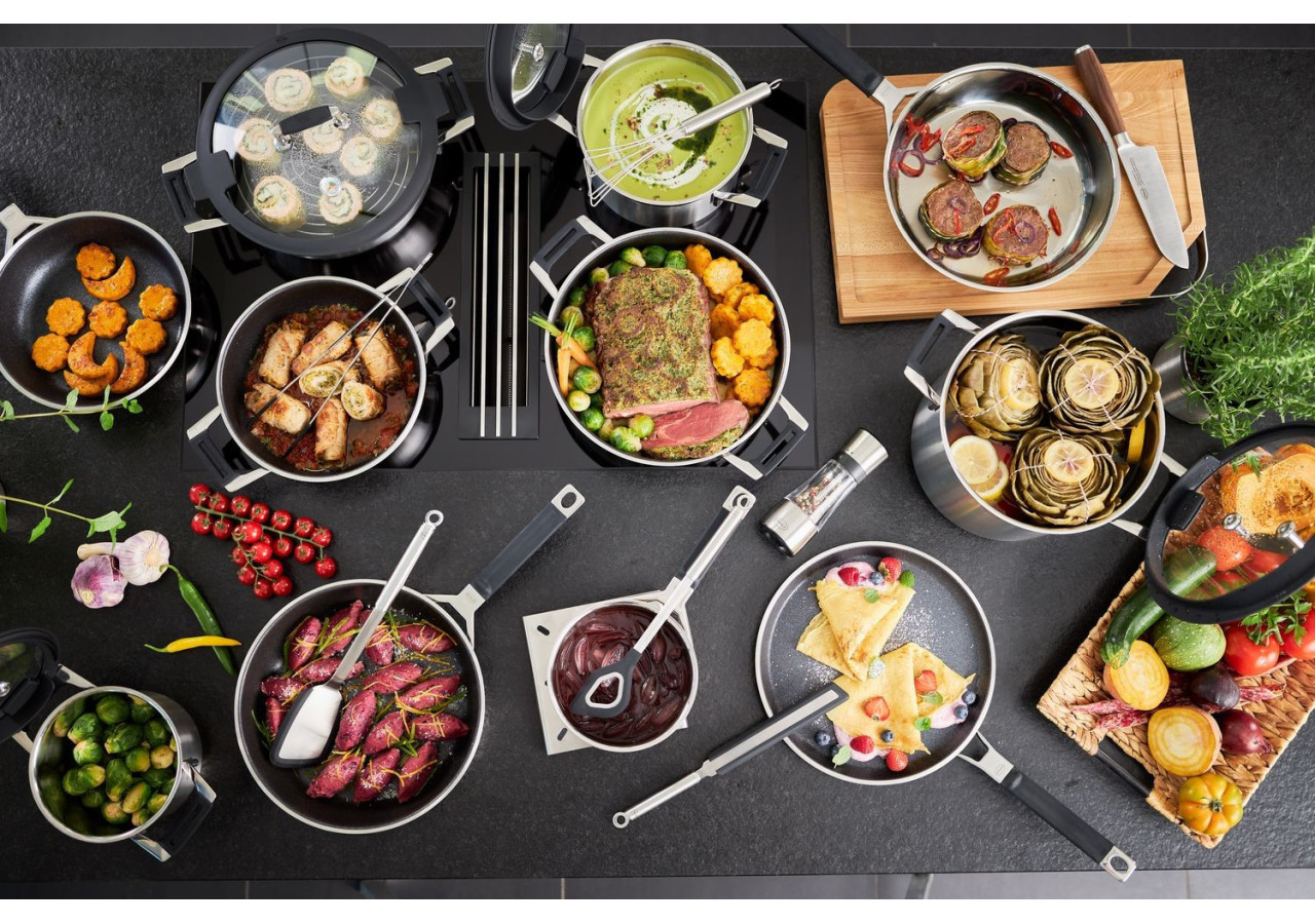 Dotée d'un revêtement antiadhésif ProResist renforcé de particules de carbure de silicium, elle est extrêmement durable et compatible avec les ustensiles en métal. Ses poignées en silicone offrent une prise sécurisée et disposent d'un système de rangement pratique pour vos ustensiles.