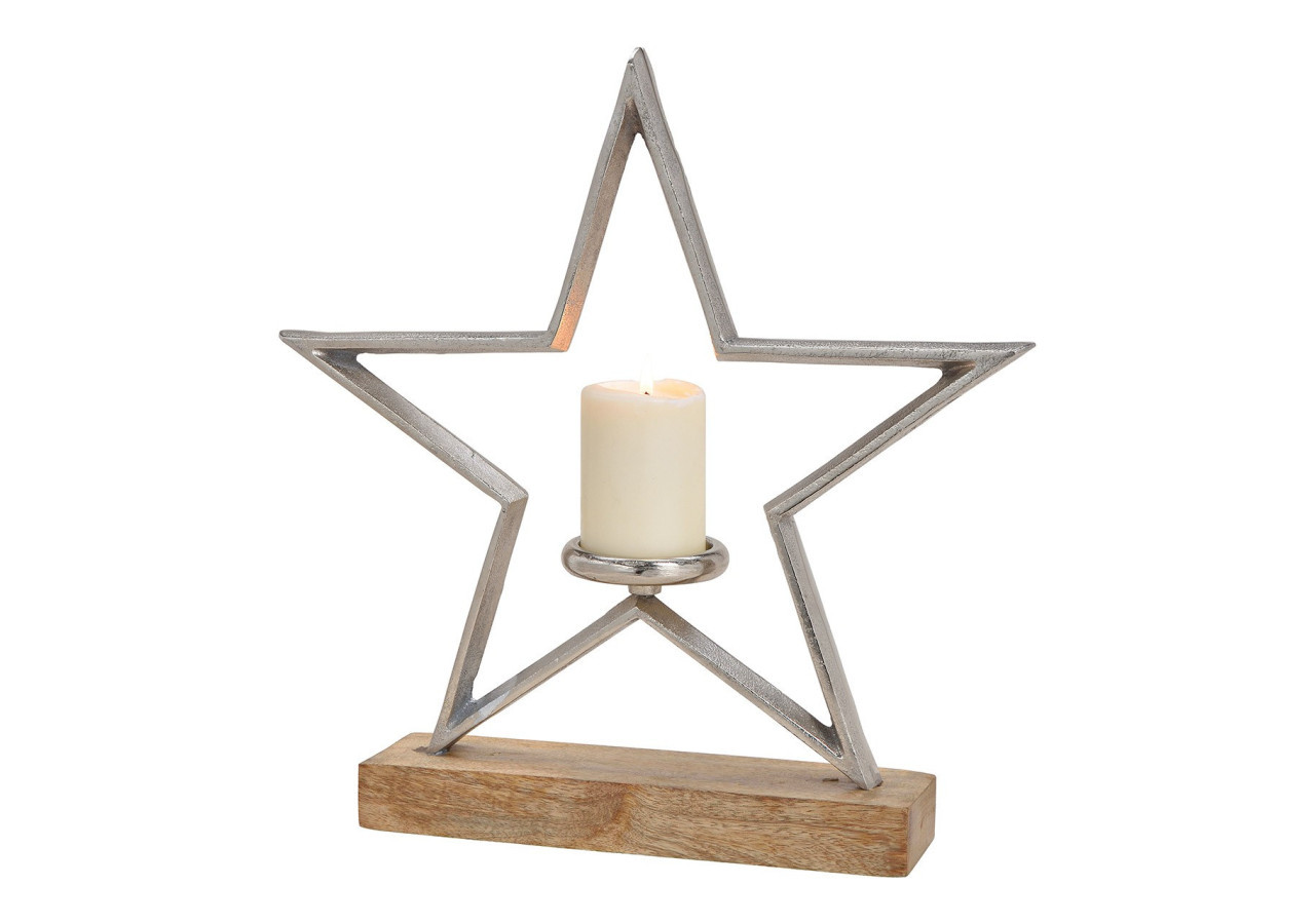 Illuminez vos soirées avec ce bougeoir en forme d'étoile. Fabriqué en métal avec un socle en bois de mangue, il mesure 42x43x8cm et apporte une ambiance chaleureuse à votre espace.