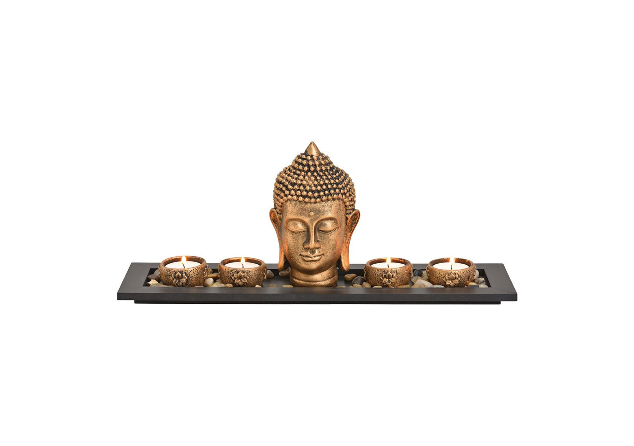 Créez une atmosphère chaleureuse avec ce Buddha accompagné de son support pour 4 bougies. Fabriqué en bois et poly doré, avec des dimensions de 41x17x11cm, il est parfait pour illuminer vos soirées tout en ajoutant une touche spirituelle à votre décoration.