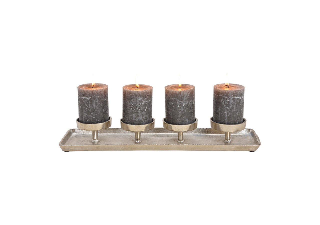Créez une ambiance chaleureuse lors de vos dîners avec ce centre de table en métal argent doté de bougeoirs pour 4 bougies. Avec ses dimensions de 44x6x12cm, il s'intègre parfaitement à toute table.