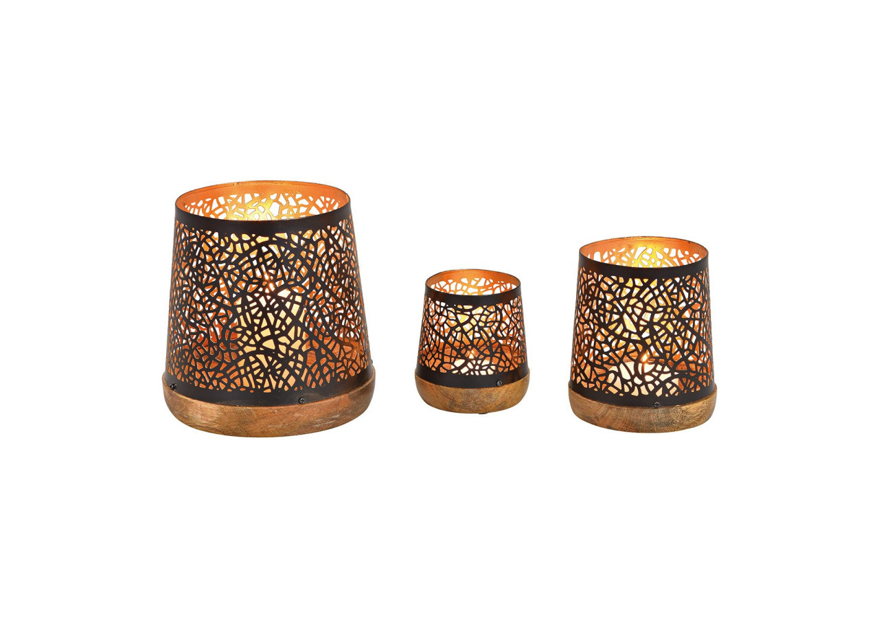 Ajoutez une touche de sophistication à votre intérieur avec ce set de photophores en métal sur socle en bois de mangue. Ce 3 pièces se décline en dimensions variées : 17x19x17cm, 12x14x12cm, 10x11x10cm. Parfait pour créer une ambiance chaleureuse et accueillante.
