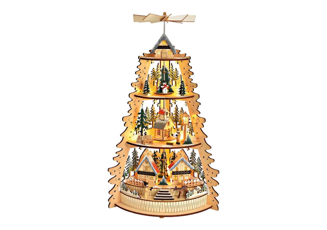 Cette pyramide de Noël en bois naturel de 31x52x17cm est l'élément décoratif parfait pour vos fêtes. Équipée d'une fonction timer, elle crée une atmosphère magique tout en étant alimentée par des piles (3xAA non incluses).