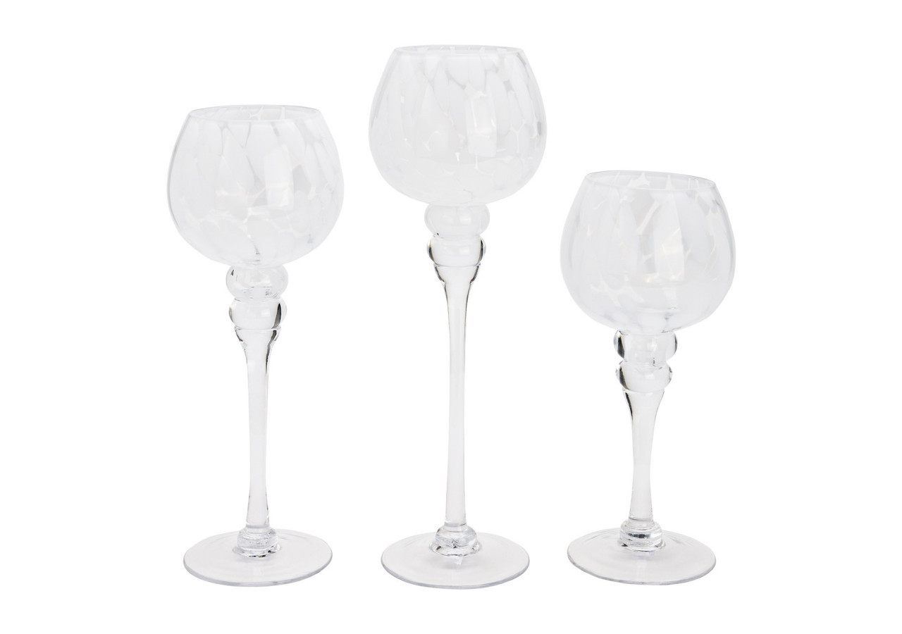 Ajoutez une touche d'élégance à votre intérieur avec ce set de 3 photophores en verre. Leur design unique avec des points et leur couleur blanche/transparente apportent une atmosphère chaleureuse et apaisante. Mesurant respectivement 30, 35 et 40 cm de hauteur, ils sont parfaits pour créer une ambiance lumineuse dans votre salon ou sur votre terrasse.