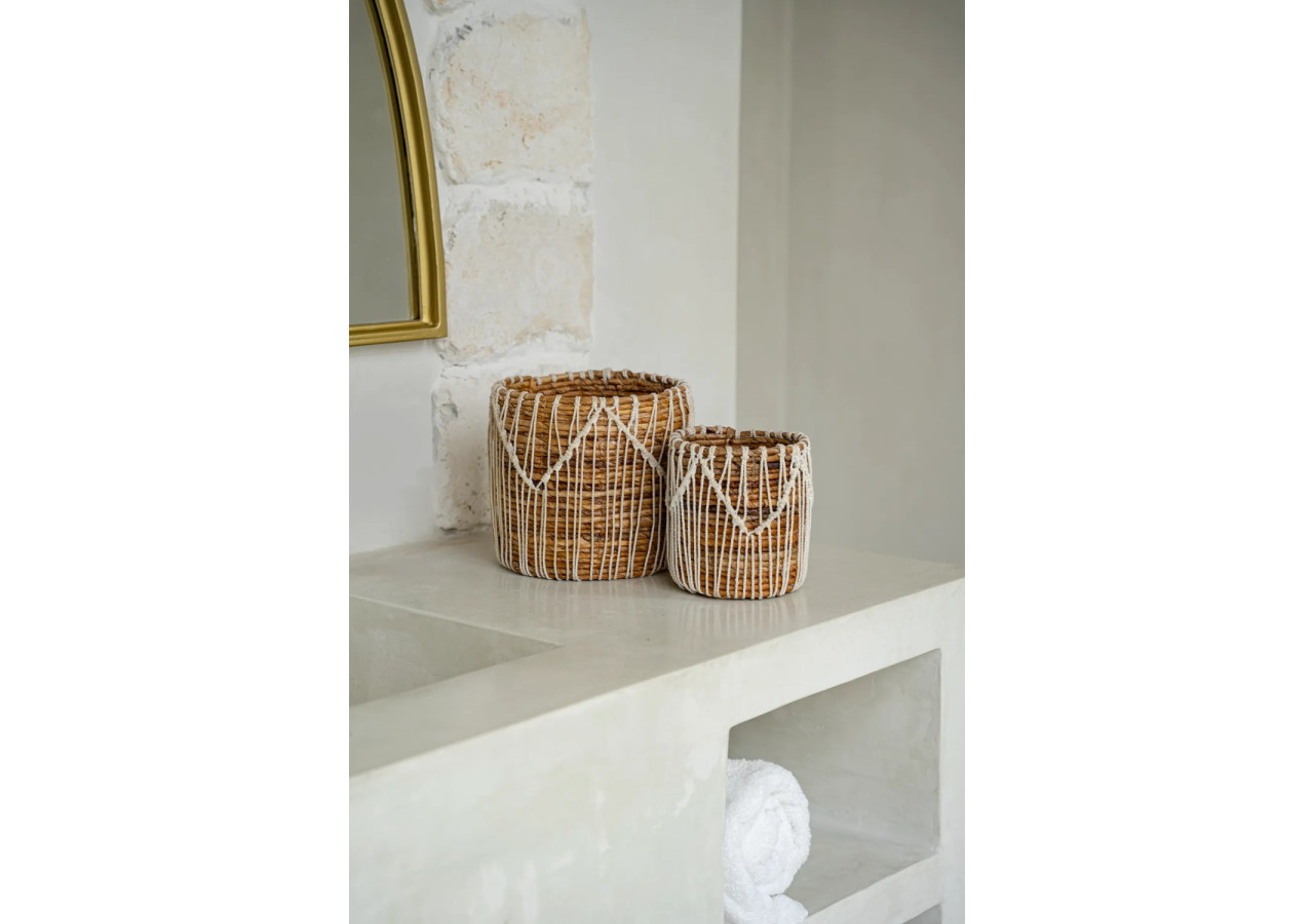 Découvrez notre panier Macra-Mazing, conçu avec soin à partir de feuilles de bananier et de coton. Ses tons terreux et son design en macramé ajoutent une élégance naturelle à n'importe quel espace. Choisissez la taille qui convient le mieux à vos besoins ou optez pour l'ensemble des trois tailles pour une touche harmonieuse dans votre décoration !