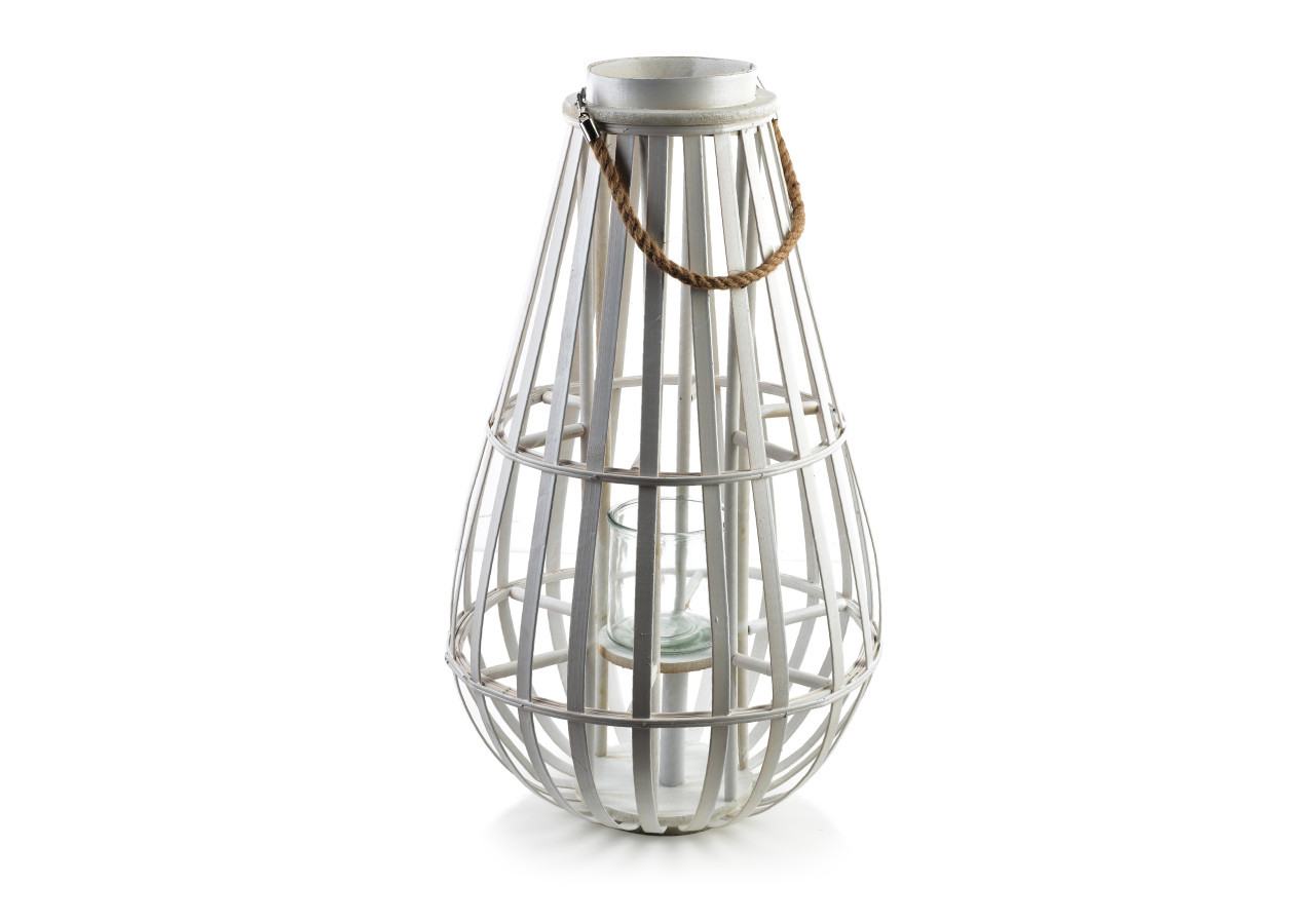 Apportez une touche chaleureuse à votre espace avec le Lampion LUCIE WHITE. Ce lampion en osier moderne est doté d'un support en verre pour accueillir vos bougies.