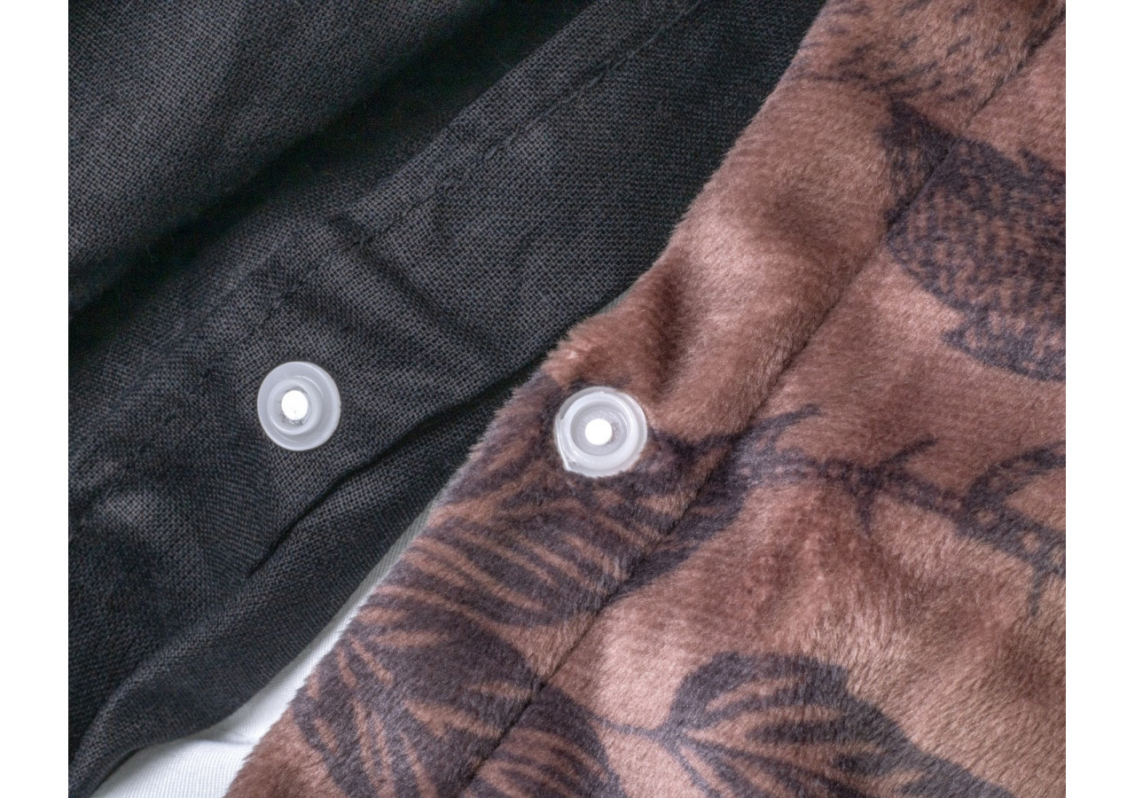 La face avant présente une impression botanique colorée, tandis que l'arrière est d'une teinte unie, offrant ainsi deux styles en un. Avec une longueur de 220 cm, elle se ferme facilement grâce à des boutons-pression.