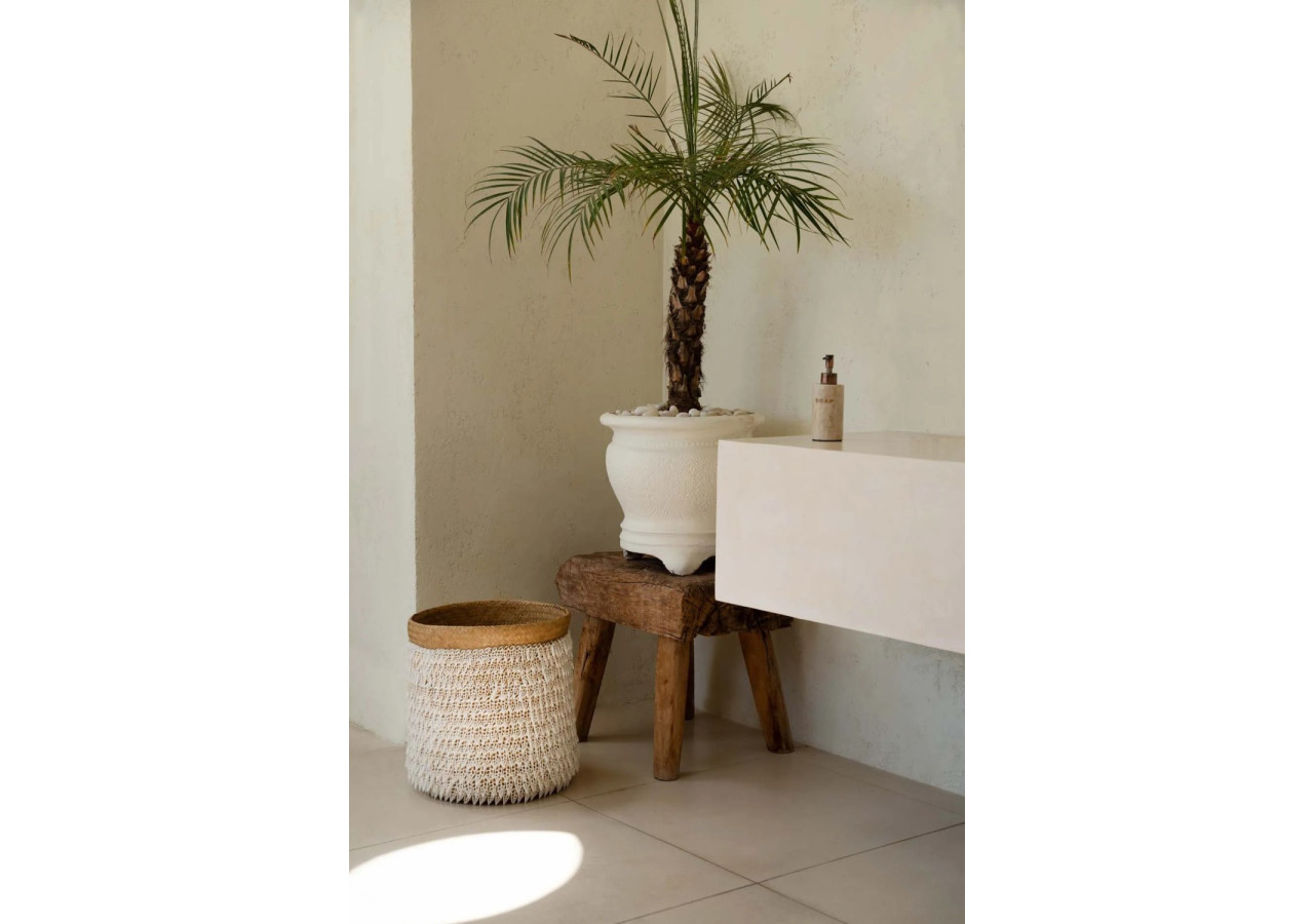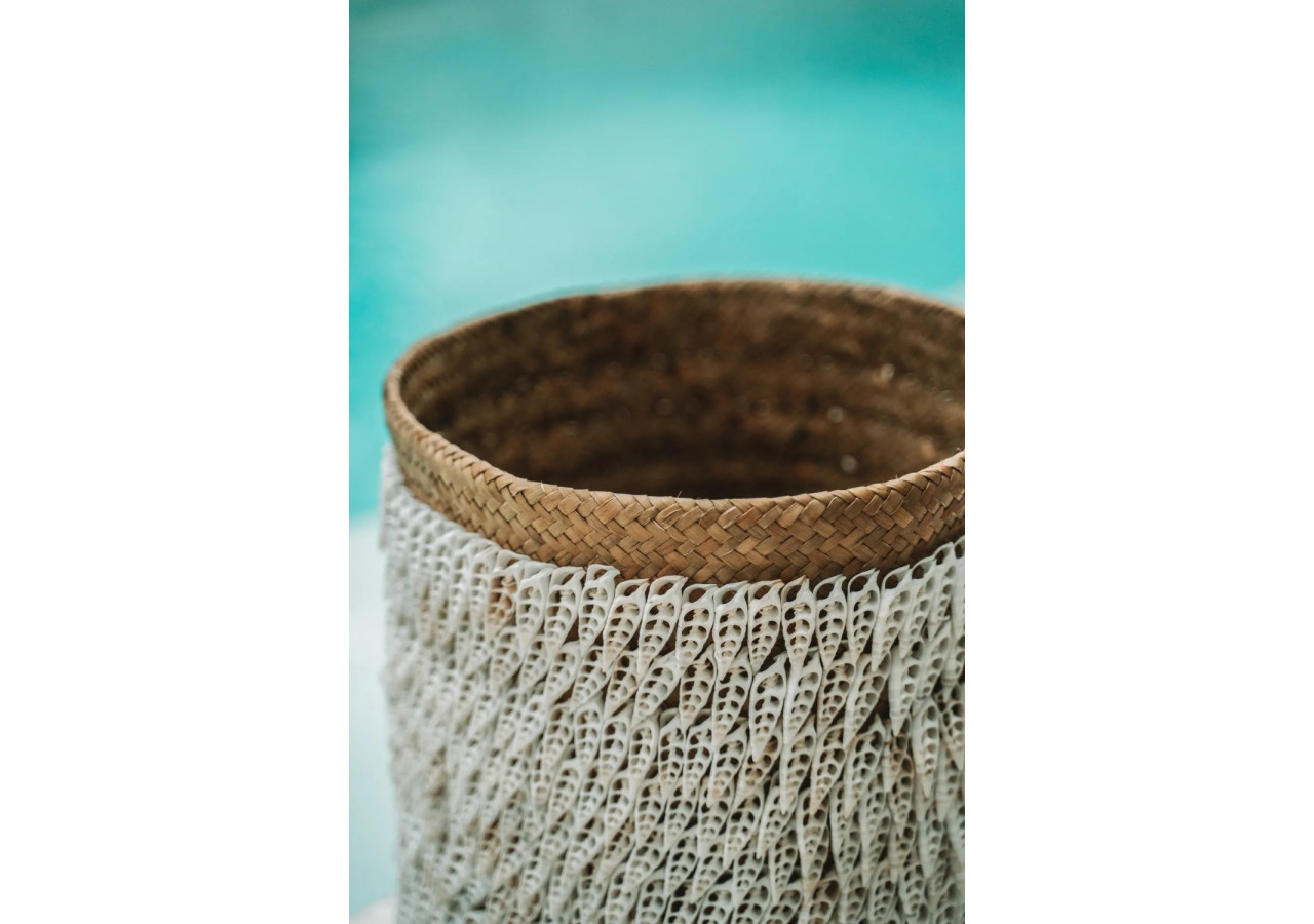 Ce panier fabriqué à partir de la plante de pandan et orné de coquillages collectés sur les plages balinaises est un véritable chef-d'œuvre. Avec ses détails exceptionnels, ce panier fait à la main est parfait pour ranger vos affaires ou pour mettre en valeur une grande plante.