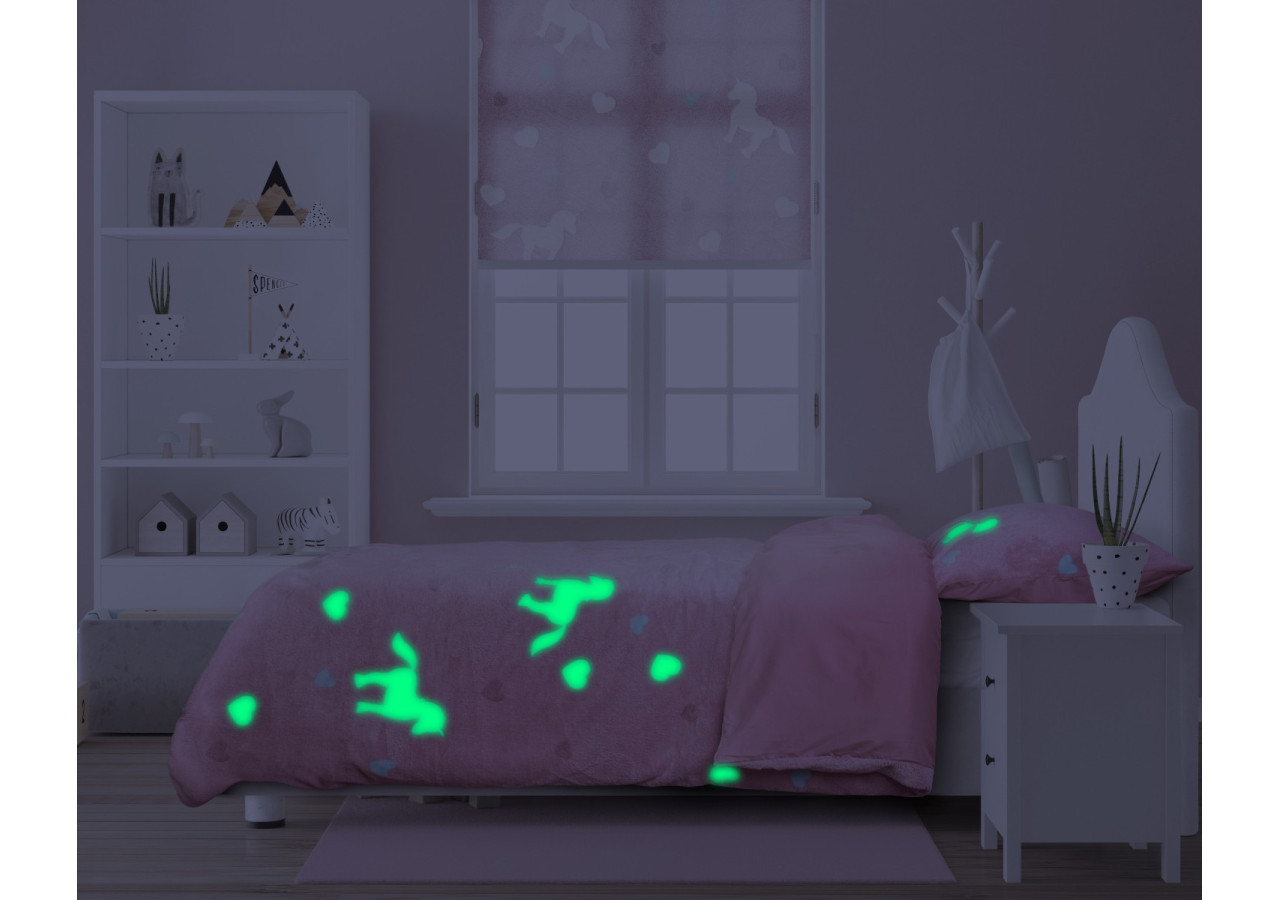 Avec un design enchanteur présentant une licorne sur le devant et une finition unie au verso, cette housse offre un effet phosphorescent qui illumine la nuit, rendant chaque coucher captivant.