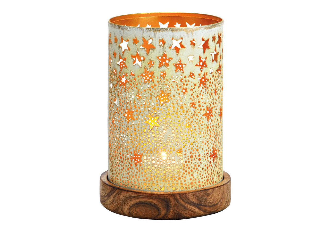 Apportez une touche d'élégance à votre intérieur avec cette lanterne en métal blanc et doré, reposant sur un socle en bois de manguier. Ses dimensions compactes de 10x18x10cm en font un accessoire parfait pour toutes vos tables ou étagères.