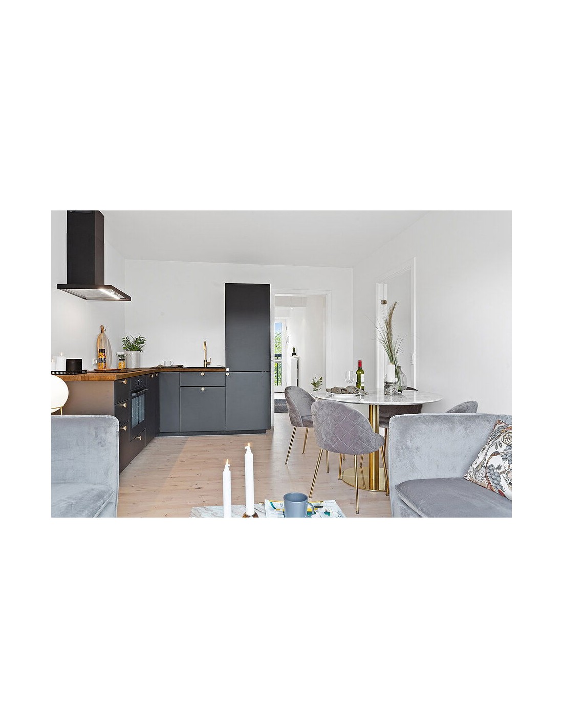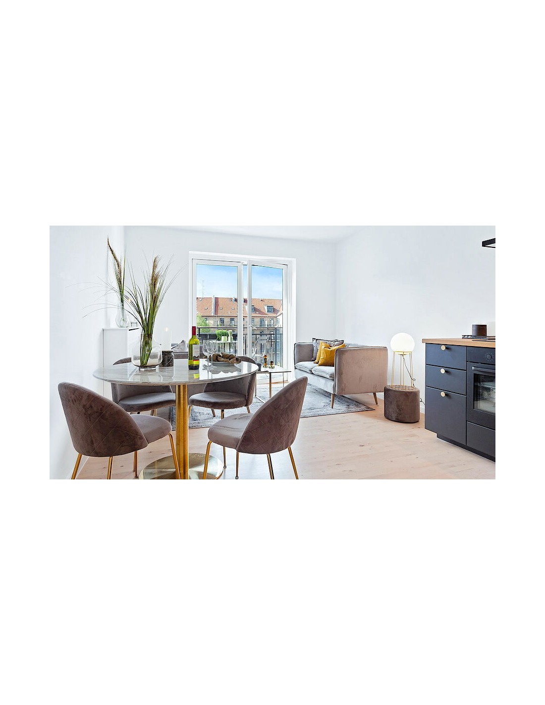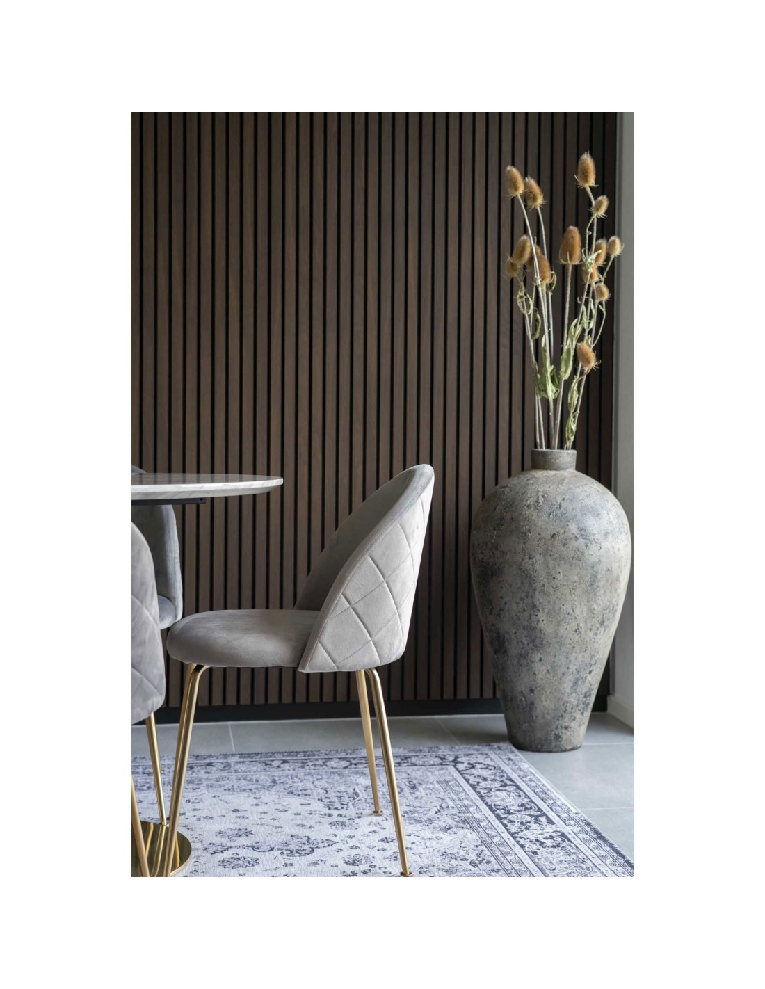 Optez pour la Chaise de Salle à Manger Geneve en velours gris avec pieds en laiton. Son élégance sobre et son confort vous séduiront, tout en apportant une touche de sophistication à votre salle à manger.