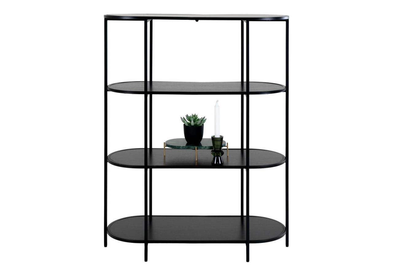 Apportez du style à votre intérieur avec l'Étagère Vita, une étagère ovale au cadre noir et quatre étagères noires. Avec des dimensions de 85 x 36 x 111 cm, elle offre un espace de rangement unique qui devient un véritable élément décoratif dans votre maison.