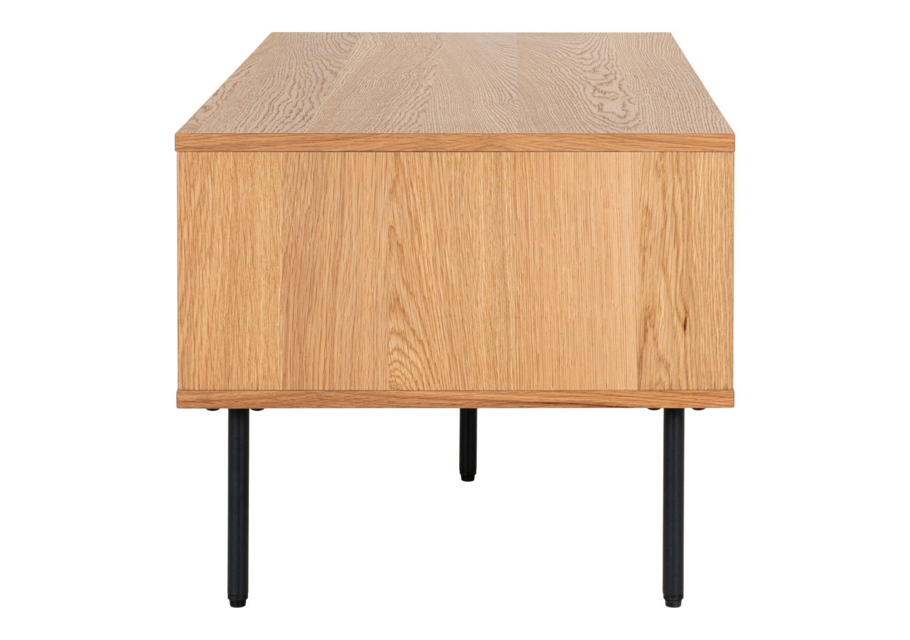 Élevez votre espace avec la Table Basse Kyoto. Fabriquée en placage chêne avec des pieds en métal noir, elle allie robustesse et élégance. Dotée de 2 tiroirs, cette table basse de 50 x 100 x 45 cm offre un rangement pratique tout en ajoutant une touche contemporaine à votre salon.