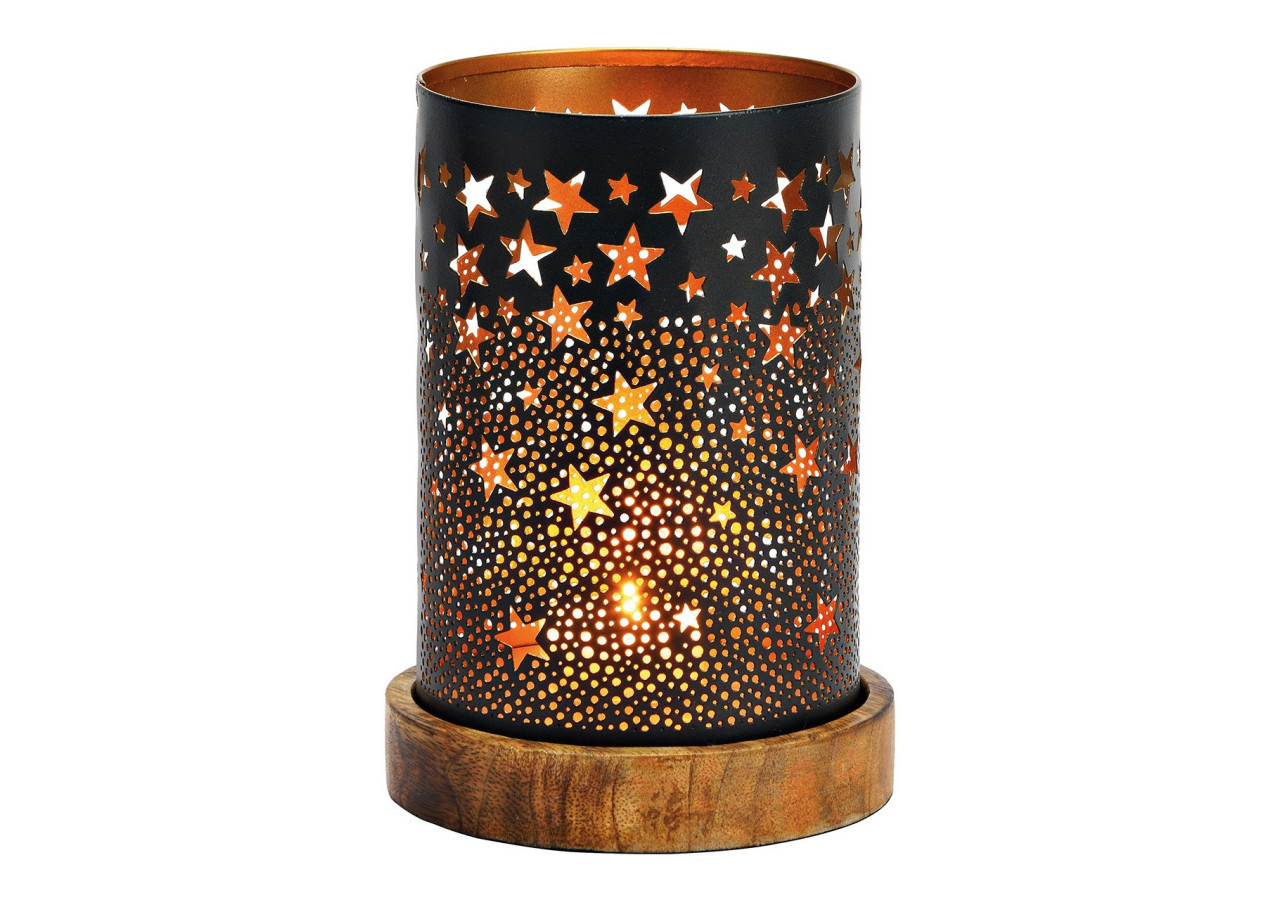 Ajoutez une touche moderne à votre espace avec cette lanterne en métal noir et doré, montée sur un socle en bois de manguier. Compacte avec des dimensions de 10x18x10cm, elle s'adapte à toutes les décorations.