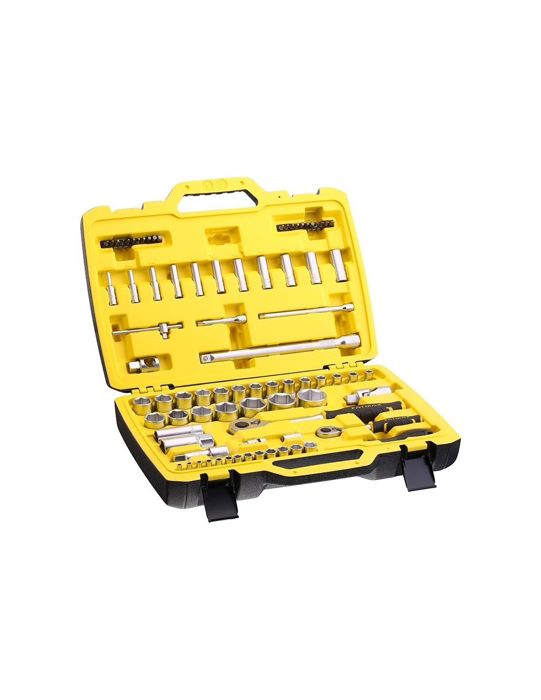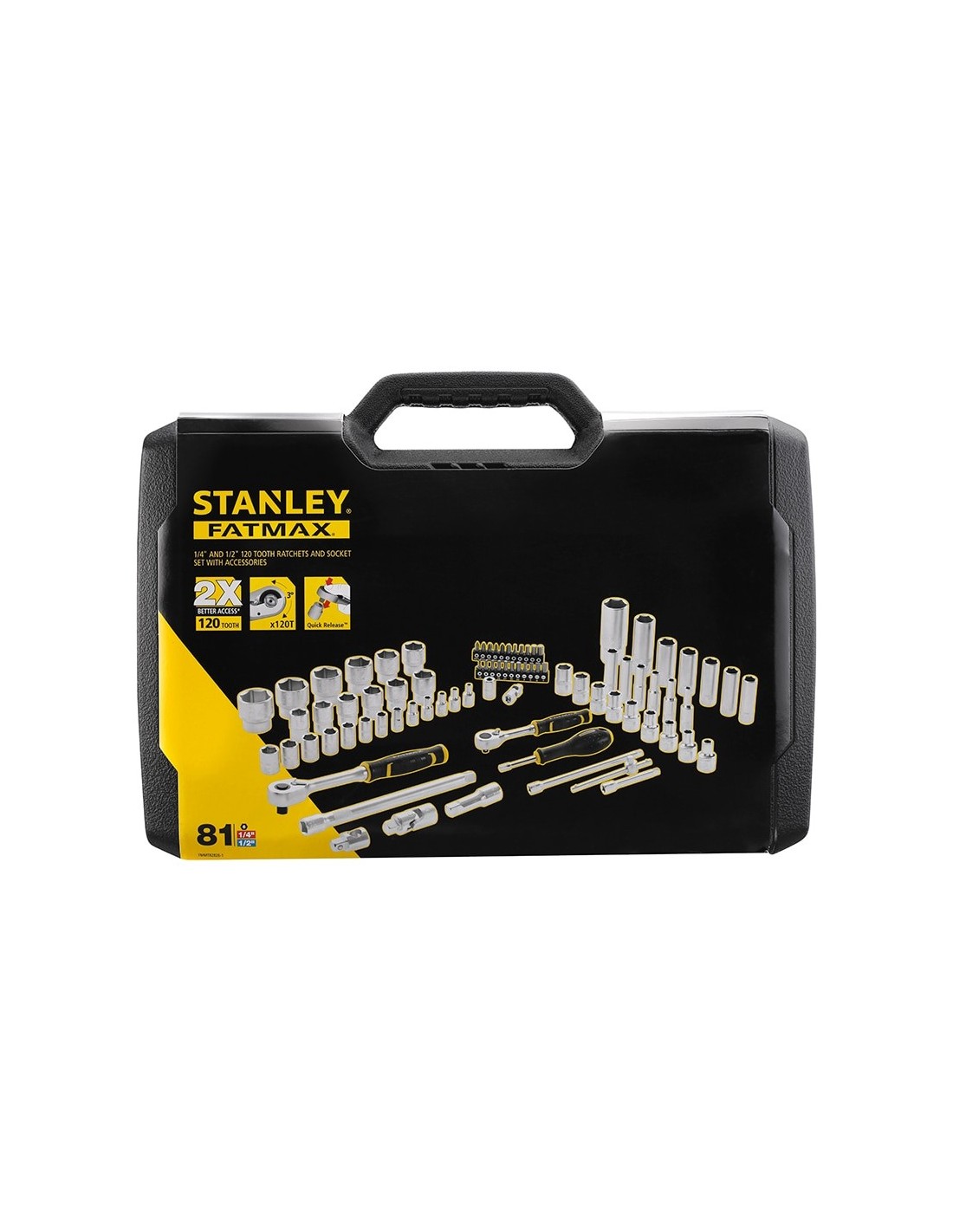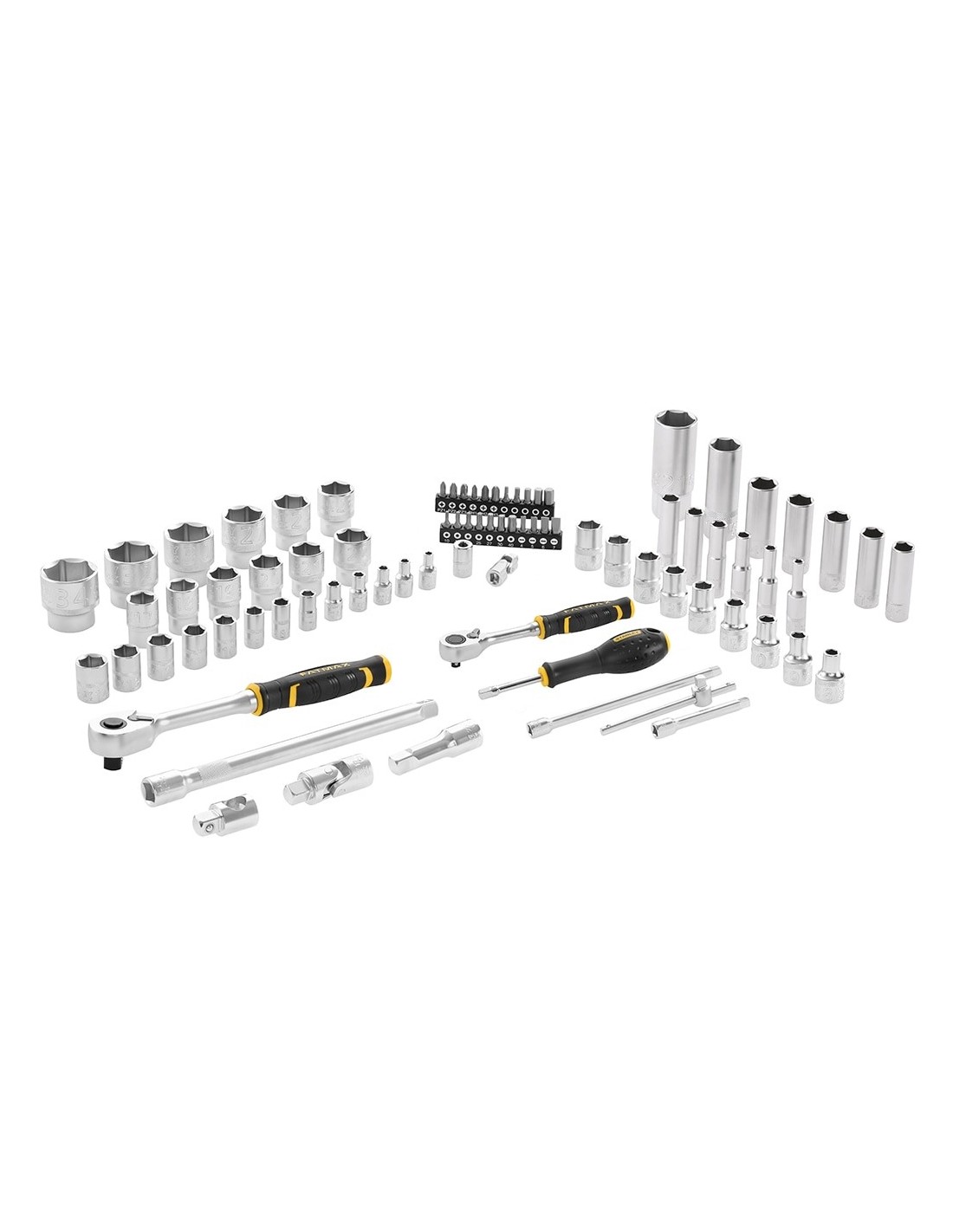 - 1 Cliquet 120 dents ¼’’ FATMAX - 13 Douilles ¼” (6 pans) : 4 – 4,5 – 5 – 5,5 – 6 – 7 – 8 – 9 – 10 – 11 – 12 – 13 – 14 mm - 11 Douilles Longues ¼” (6 pans) : 4 – 5 – 6 – 7 – 8 – 9 – 10 – 11 – 12 – 13 – 14 mm - 2 Rallonges ¼’’ : 75 – 150 mm - 1 Cardan universel ¼’’ - 1 Porte-embouts ¼’’- 1 Poignée tournevis ¼’’- 1 Poignée coulissante ¼’’- 22 Embouts de vissage ¼’’: PZ1-PZ2-PZ3 – PH1-PH2-PH3 – HEX 3-4-5-6-7 – Torx 10-15-20-25-27-30-40 – Fente 4-5-6-7 - 1 Cliquet 120 dents ½’’ FATMAX - 21 Douilles ½’’ (6 pans) : 8 – 9 – 10 – 11 – 12 – 13 – 14 – 15 – 16 – 17 – 18 – 19 – 20 – 21 – 22 – 23 – 24 – 27 – 30 – 32 – 34 mm - 2 Douilles ½’’ pour bougie : 16 – 21 mm - 2 Rallonges ½’’ : 75 mm – 130 mm - 1 Cardan universel ½’’- 1 Poignée coulissante ½’’ dans un coffret compact et résistant avec attaches métal.