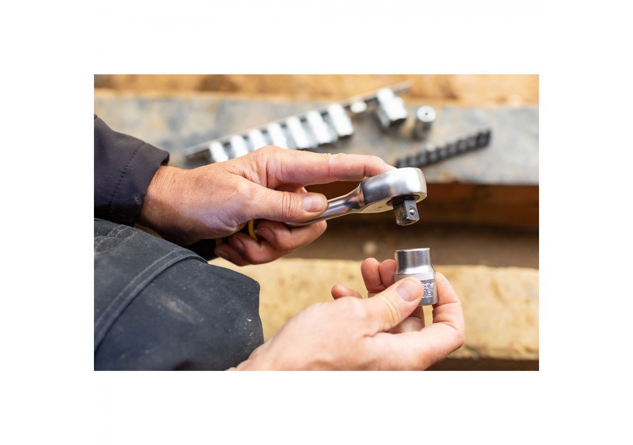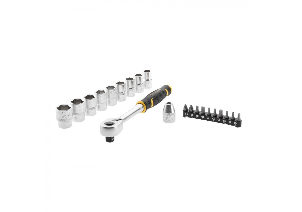 - 1 Cliquet 120 dents ½’’ FATMAX + 9 Douilles ½’’ (12 pans) : 13 – 14 – 15 – 16 – 17 – 18 – 19 – 22 – 24 mm sur rack métallique + 1 Porte-embout ½’’ pour embouts de vissage 5/16’’+ 10 Embouts de visage 5/16’’ : PH0 – PH1 - PH2-TT15-TT20-TT25-TT30 – Fente : 3,5-4,5-8