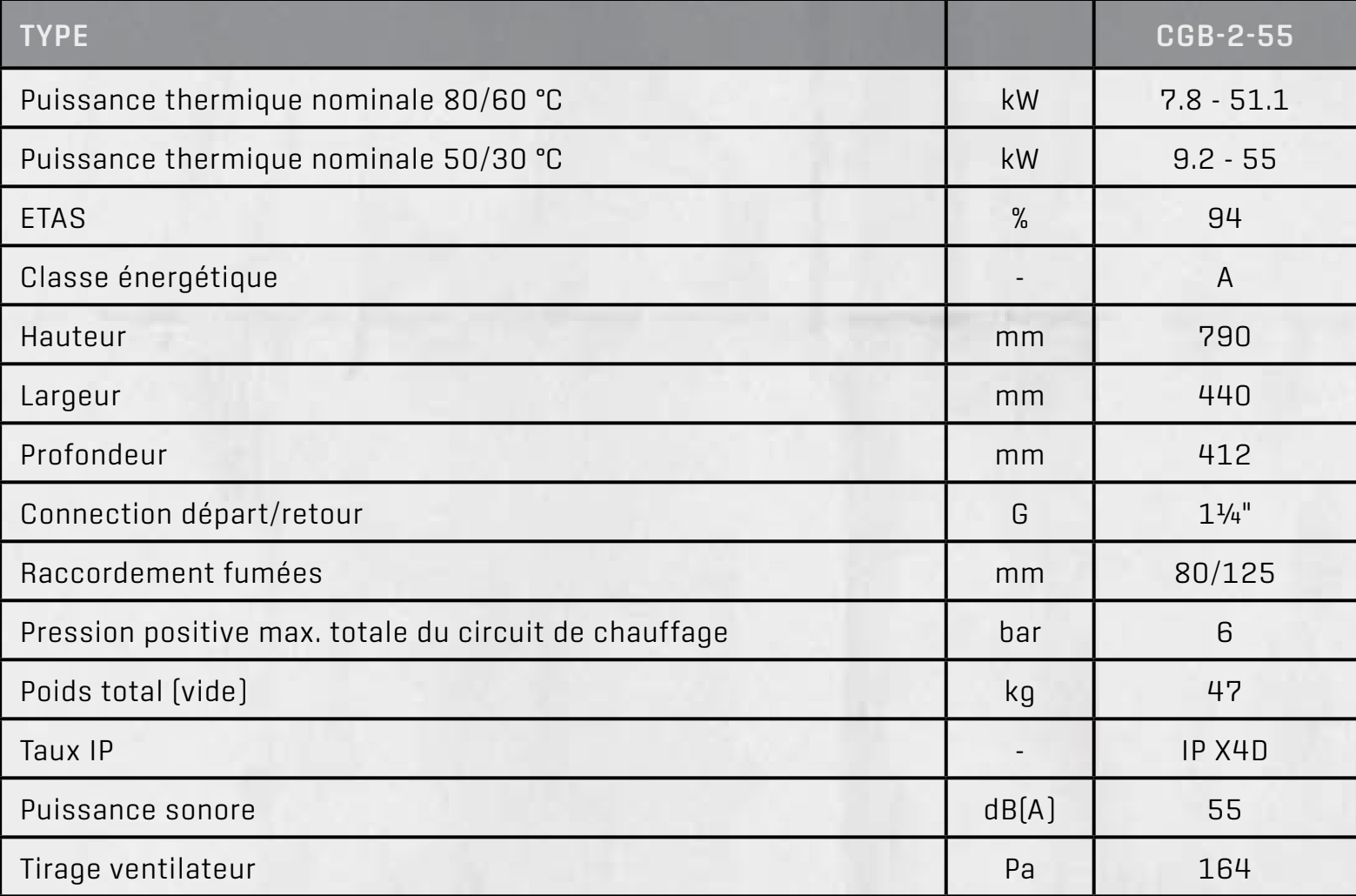 La chaudière CGB-2 55 est conçue pour de longues plages de fonctionnement avec des sollicitations maximales. Les échangeurs de chaleur à tubes à ailettes soudés par robot V4A et optimisés pour 38 et 55 kW, ont une surface 7 fois supérieure à celle des échangeurs de chaleur à tubes lisses. Adaptée pour une utilisation dans des logements collectifs, locaux commerciaux ou bureaux, il est possible d'en installer jusqu'à 5 unités e cascade. L’intégration simple dans les systèmes de gestion technique du bâtiment GTB (interface KNX ou Bacnet), l’optimisation de la condensation grâce au contrôle de la dispersion des pompes et la conversion simple au gaz naturel LL ou au GPL font de la CGB-2 55 une chaudière polyvalente.