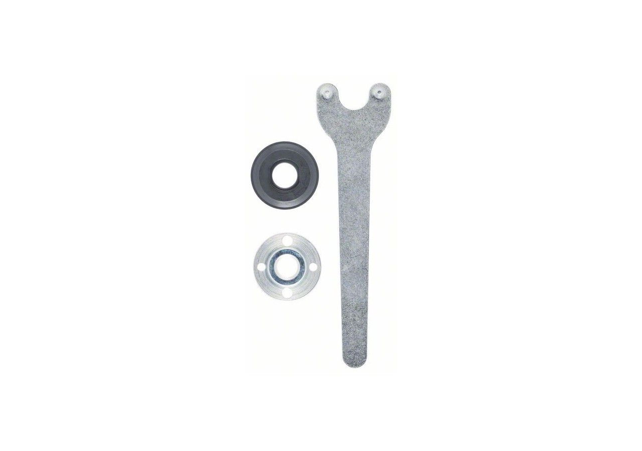 - Composé d'un écrou de serrage (1 603 340 015), d'une bride (1 605 703 084), d'une clé à ergots (1 607 950 043). Compatible avec les meuleuses angulaires fabriquées avant août 1990