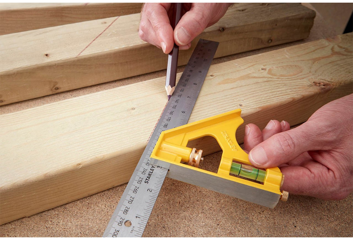 - Equerre multisusage: Equerre droite extérieur, intérieur onglet, trusquin, jaune de profondeur et Niveau 45° - 90°