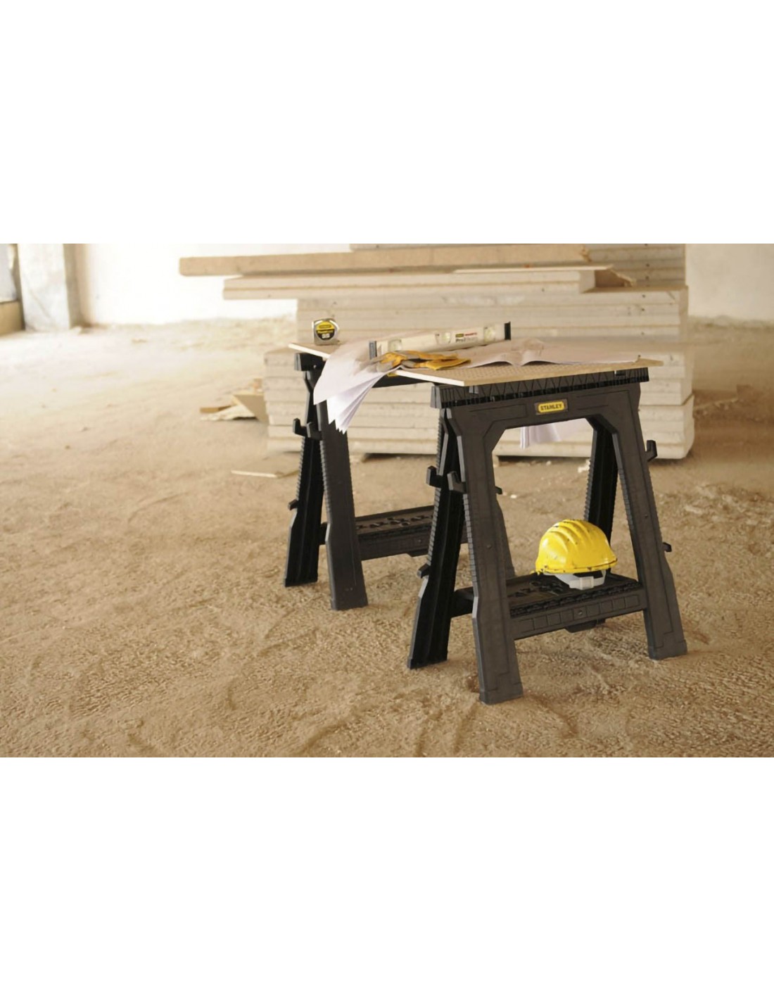 - Rainure en V intégrée sur le haut du tréteau pour les découpes