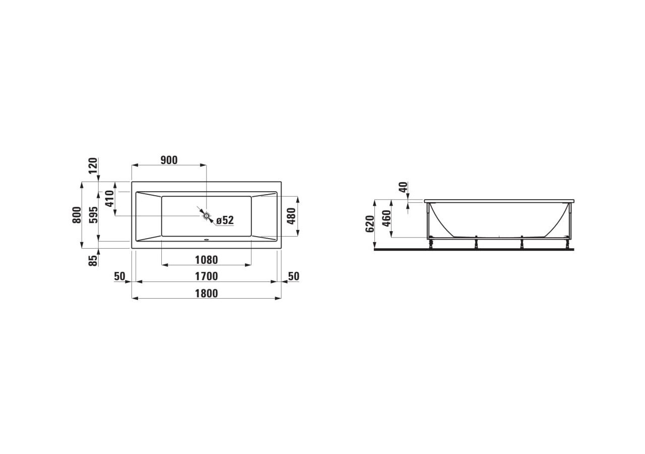 Baignoire acrylique avec piètement et cadre pour habillage, écoulement central
