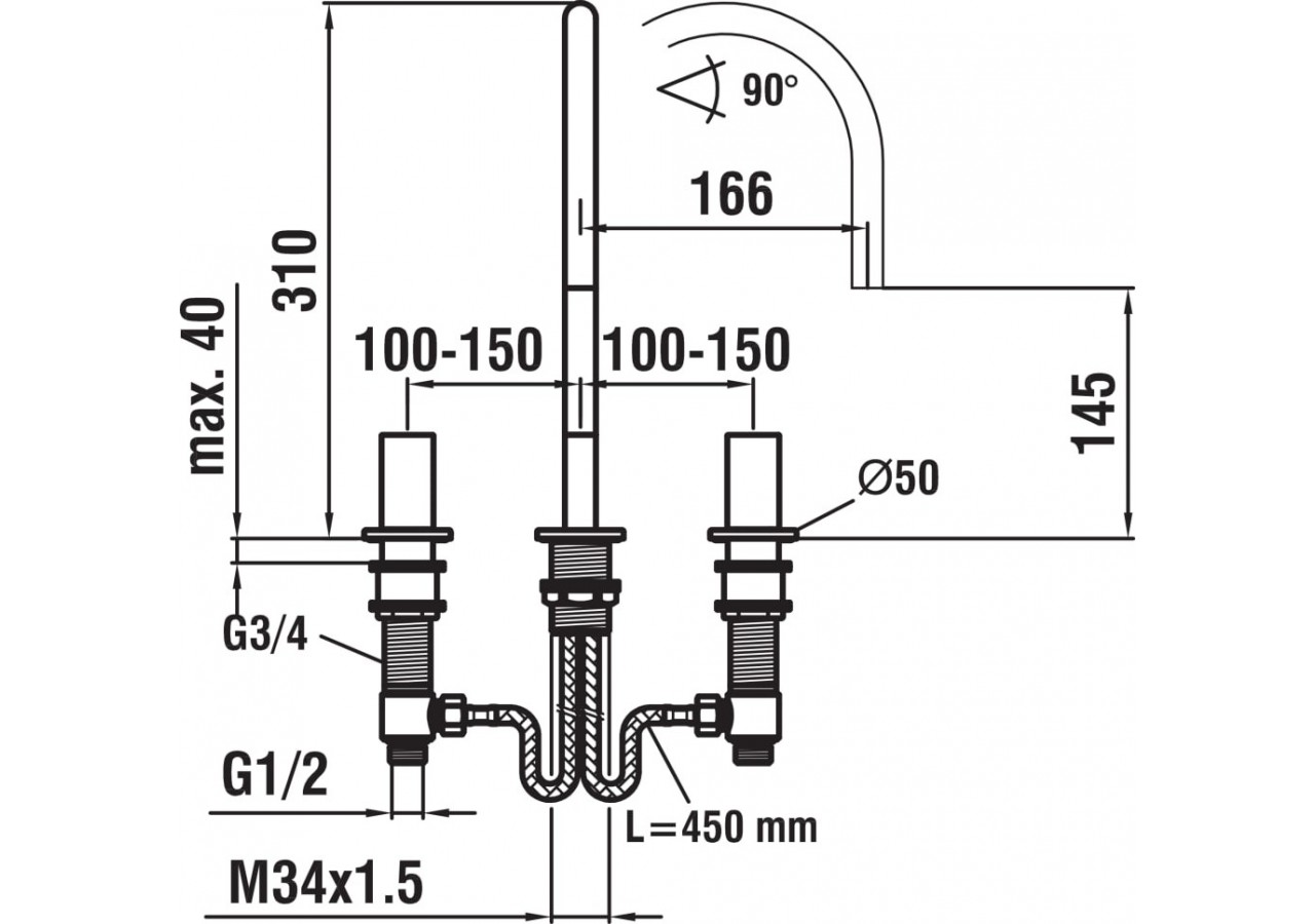 Mitigeur de lavabo 3 trous, bec orientable 166 mm, sans vidage