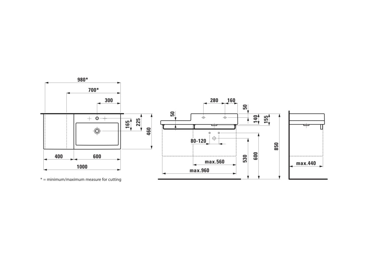 - Option: 1 trou pour la robinetterie, à couper d'un côté seulement