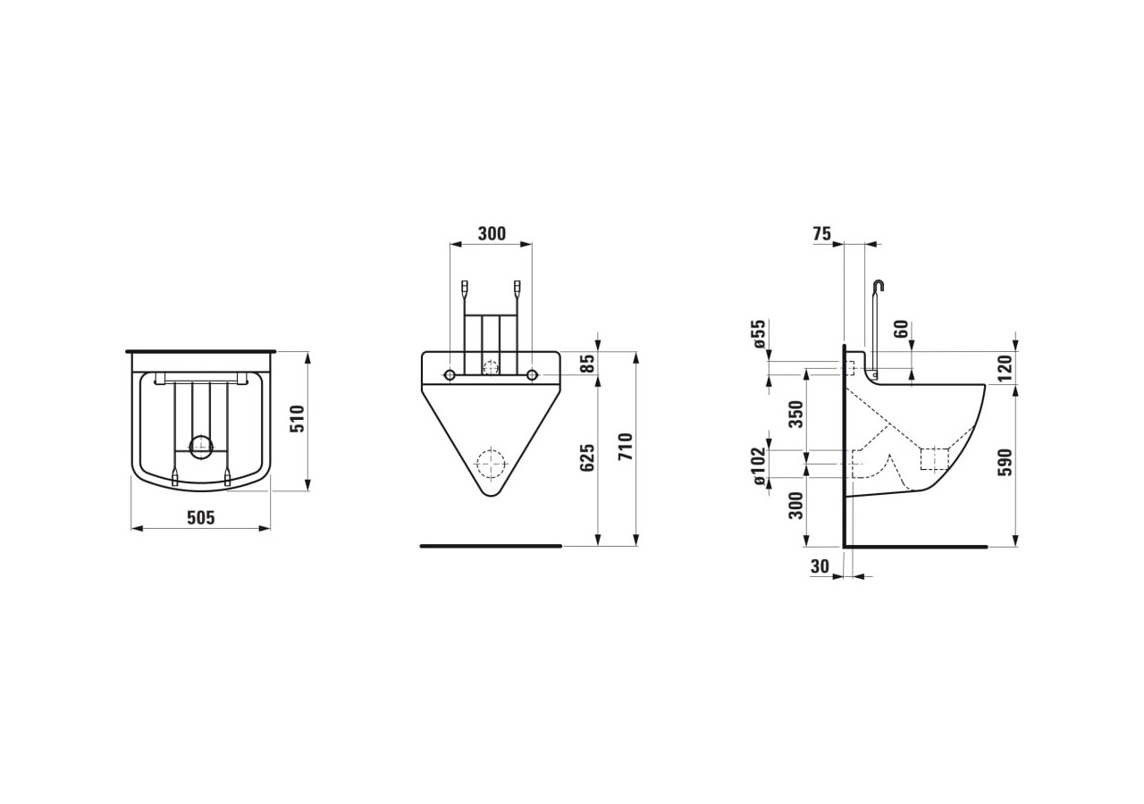 Vidoir mural, sortie d’eau par la bride périphérique, arrivée d’eau intérieure, évacuation cachée horizontale, avec grille rabattable chromée.