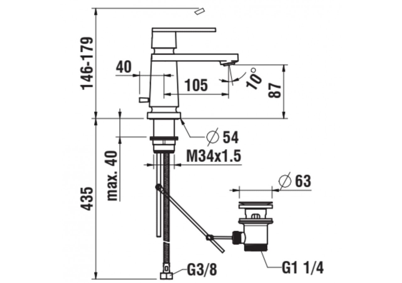 Mitigeur de lavabo monotrou, bec fixe 105 mm, avec vidage