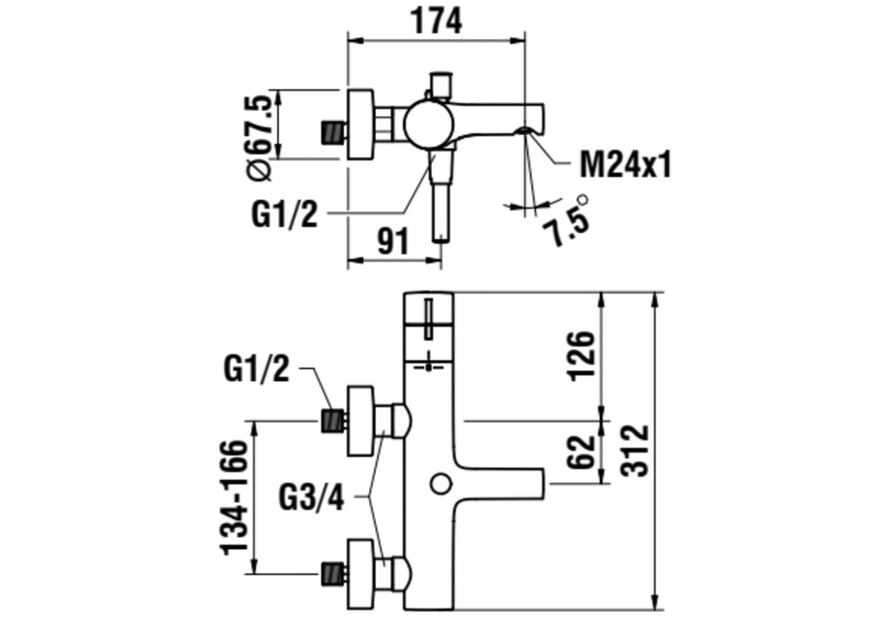 Mitigeur bain-douche thermostatique mural, avec inverseur, avec flexible et douchette
