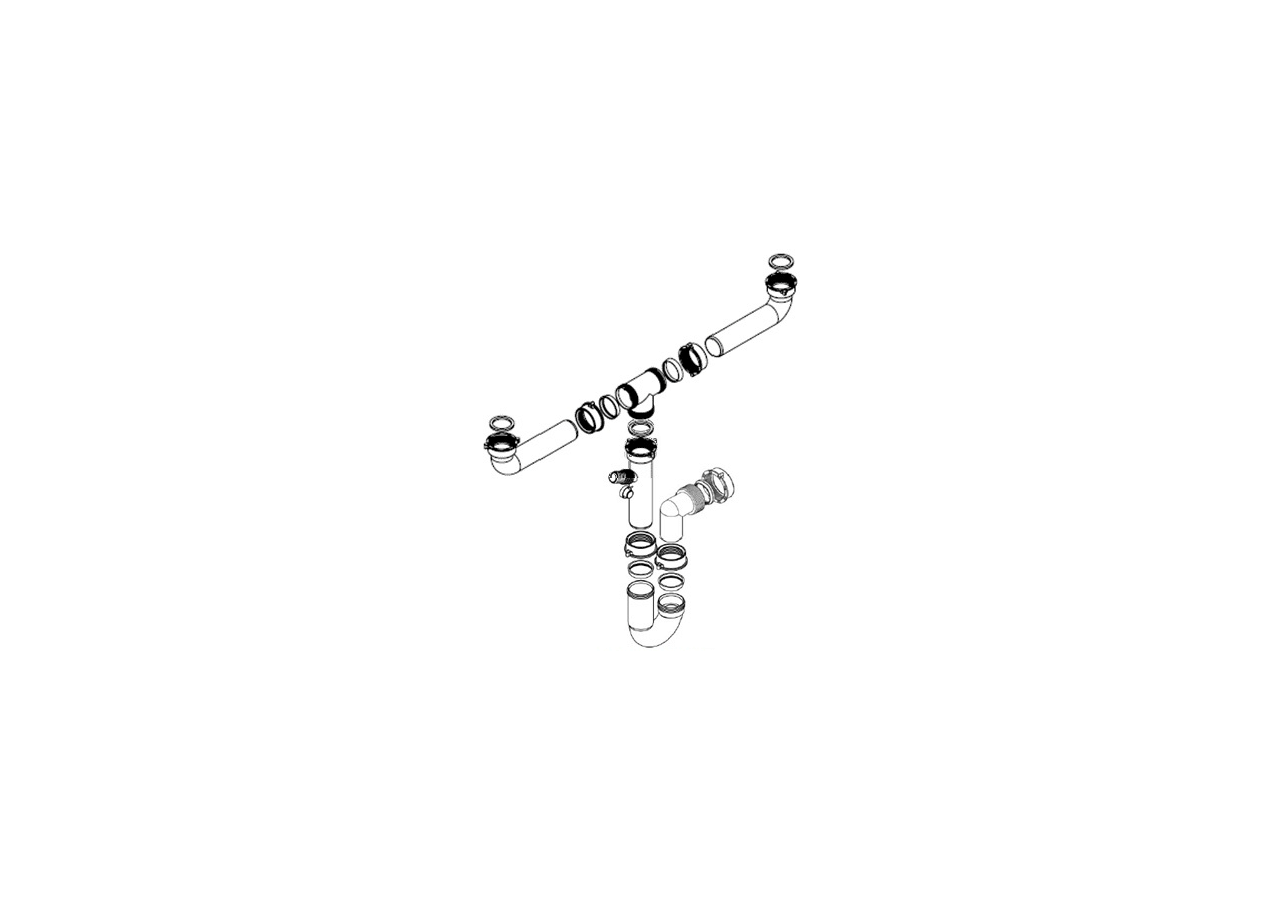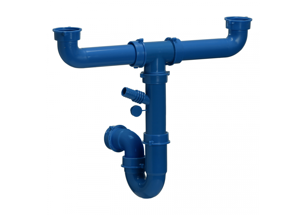 Siphon pour évier 2 cuves, sortie au mur, avec 1 prise machine à laver/lave vaisselles