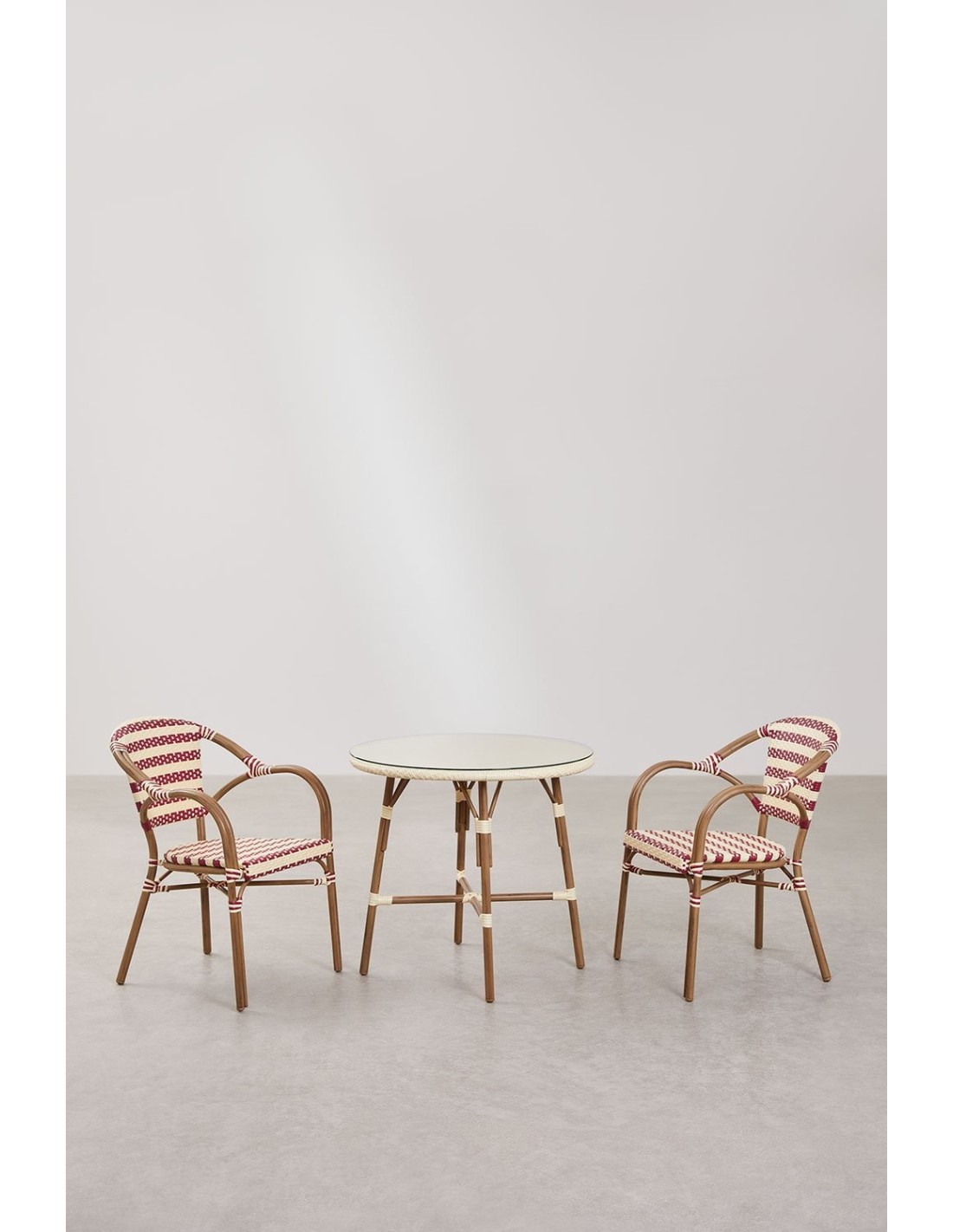 Description Ensemble table ronde Ø80 cm Brielle Bistro et 2 chaises avec accoudoirs en rotin synthétique et aluminium Solange Bistro Apportez le charme des bistrots parisiens dans le confort de votre maison avec le Set de table ronde (Ø80 cm) Brielle Bistro et 2 chaises avec accoudoirs en rotin synthétique et aluminium Solange Bistro. Cet ensemble à la fois sophistiqué et fonctionnel se distingue par son design raffiné qui fusionne l'essence classique avec une touche moderne. La table ronde dispose d'une taille compacte parfaite pour partager des moments spéciaux avec vos proches, tandis que le plateau en rotin synthétique tressé, protégé par une plaque de verre de haute qualité, combine style et durabilité à la perfection. La structure en aluminium avec une finition imitant la texture chaleureuse du bois est idéale pour compléter n'importe quel intérieur avec bon goût. Les chaises Solange Bistro, avec accoudoirs inclus, possèdent une structure en aluminium avec finition en peinture en poudre qui assure une résistance à l'usage quotidien, tandis que le dossier et l'assise en un raffiné tressage de rotin synthétique deviendront le centre de toutes les attentions. Les pieds ont été conçus pour protéger vos sols grâce aux patins protecteurs qui éviteront des dommages indésirables. En définitive, cet ensemble infusera le style typique des cafés parisiens avec un clin d'œil nostalgique au rétro. Créez un espace accueillant où fonctionnalité et design vont de pair, faisant de chaque occasion une expérience spéciale et distinctive. Pour un entretien correct, nous conseillons le nettoyage avec un chiffon humide, en évitant l'utilisation de produits chimiques. Pour plus d'informations, consultez les produits unitaires. Dans certains cas, les images, les dimensions et les couleurs, ainsi que les noms, sont orientatifs. Tout ce que vous voyez sur l'écran peut être altéré par différents facteurs, entre autres, la configuration de votre écran, la lumière ambiante, l'angle de vision, etc. Si le client désire en savoir plus, il devra contacter notre service client car les retours produits dû à ce motif, seront à la charge du client.