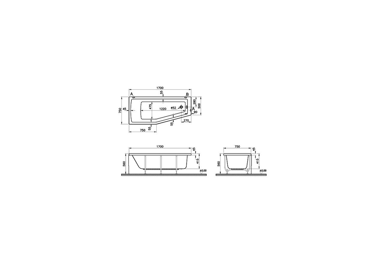 Integra baignoire à encombrement réduit, à encastrer, 170 x 75 cm, angle à gauche, en acryl. 4mm, sans trou de robinet, sans tablier
