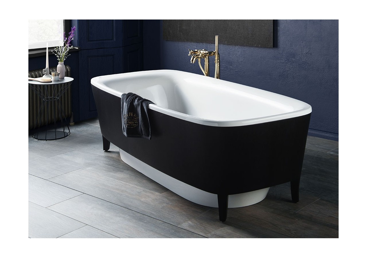 Water Jewels baignoire îlot en acryl. sanitaire 5mm, cache-bonde chromé & habillage avec pieds en bois noir, prémontage en usine, pieds réglable, 190 cm, blanc, incl. système d‘écoulement, sans trou pour robinet